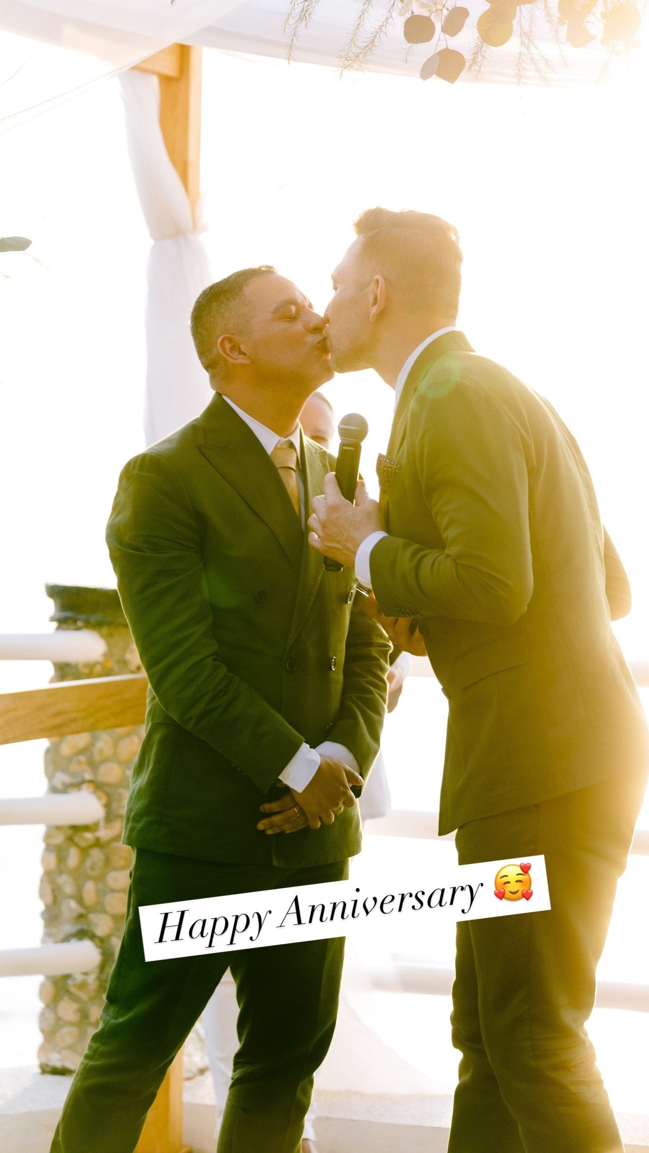 В Instagram-stories Хветкевич опублікував зворушливі фото з весільної церемонії в Мексиці. На знімках бізнесмен та його чоловік позували в однакових елегантних костюмах. Ймовірно, саме у цей момент вони обмінювалися весільними обітницями, що завершилося ніжним поцілунком. Андрій Хветкевич був небагатослівним, підписавши фото англійською мовою: “З річницею”, доповнивши його смайликом із сердечками.