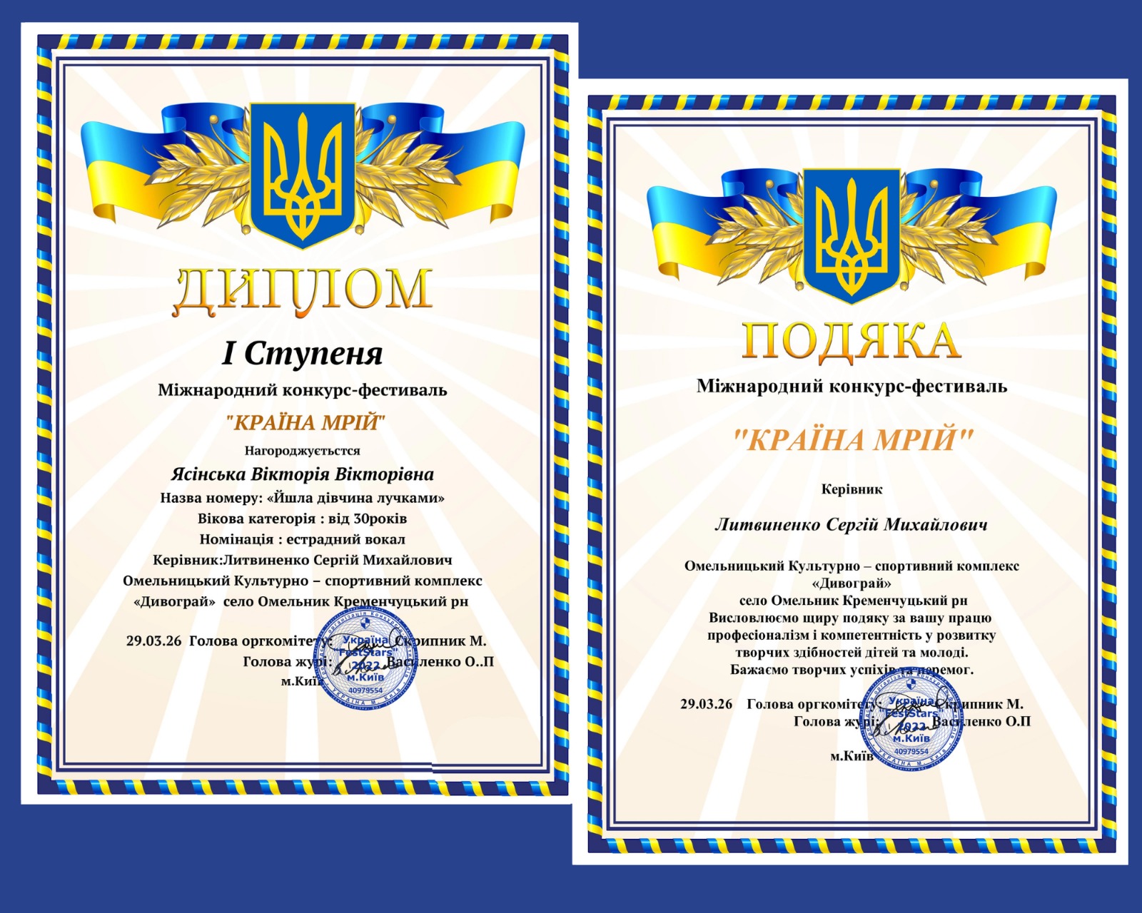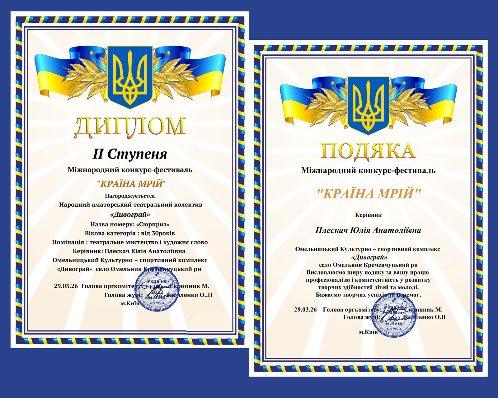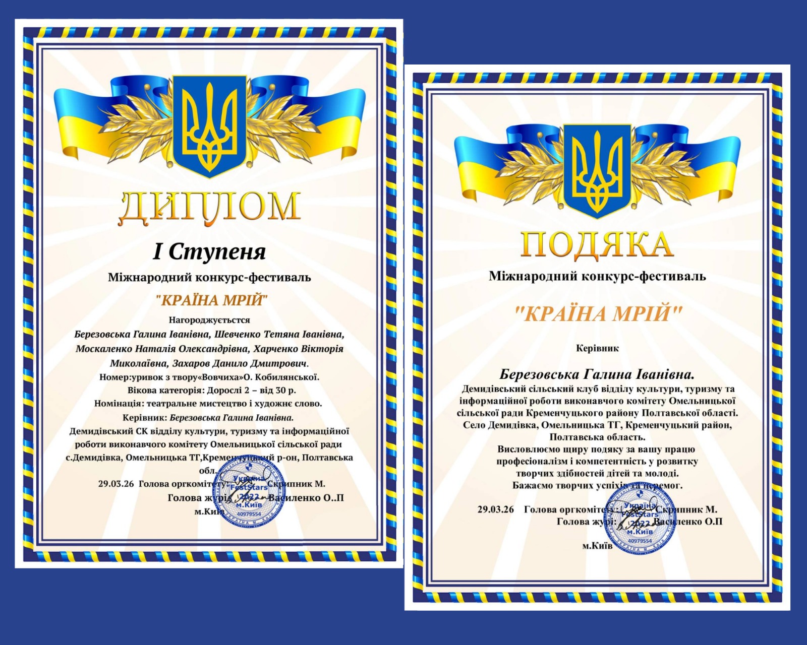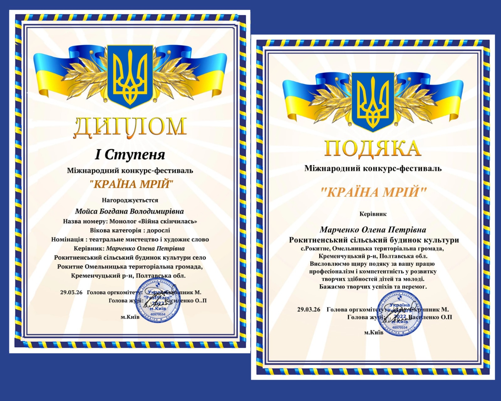 Талановиті аматори Омельницької територіальної громади гідно представили свій край на міжнародному конкурсі-фестивалі «Країна мрій», що відбувся у дистанційному форматі в березні 2026 року (м. Київ).