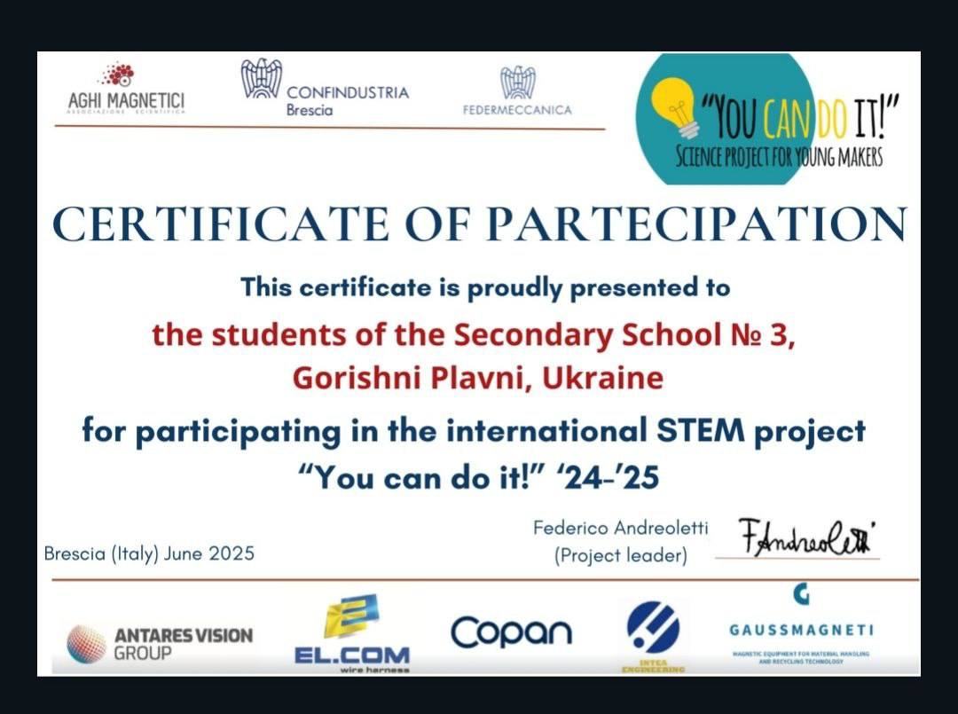 Учні ЗОШ №3 міста Горішні Плавні, під керівництвом талановитої вчительки фізики Людмили Безперстової, здобули почесне 3 місце у престижному Міжнародному STEM-проєкті «You can do it!». Ця подія стала значним досягненням для української освіти та продемонструвала високий рівень підготовки наших школярів.