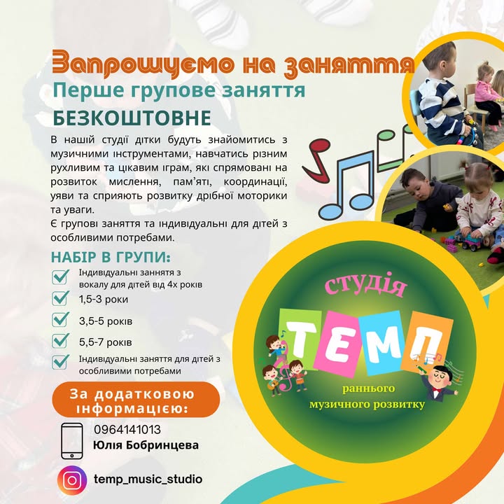 Ми з нетерпінням чекаємо на ваших дітей у музичній студії «Темп»! Розвивайтеся разом з нами!