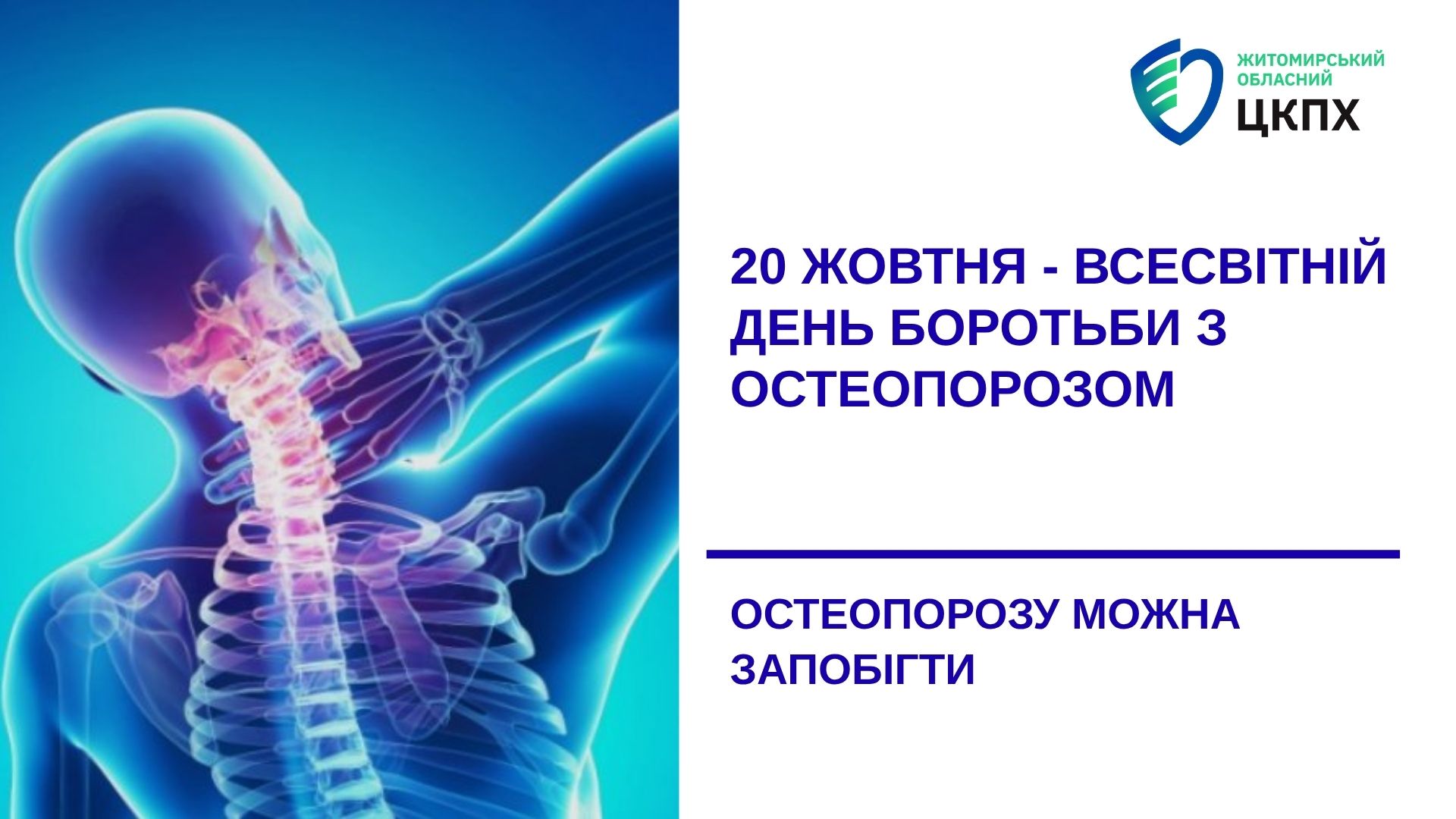 🧑⚕️У Всесвітній день боротьби з остеопорозом фахівці Житомирський обласний центр контролю та профілактики хвороб надають важливу інформацію щодо збереження здоров’я кісток. Остеопороз – це системне захворювання скелета, яке характеризується зниженням міцності кісткової тканини та значним підвищенням ризику переломів. Цей термін, введений ще в XIX столітті, описує вікові зміни, що роблять кістки більш крихкими. Проблема стає особливо актуальною з віком, оскільки люди старшого віку найчастіше страждають від переломів через ослаблення кісткової структури. Небезпека остеопорозу полягає в його безсимптомному розвитку. Переломи часто трапляються на пізніх стадіях, коли втрата кісткової маси є суттєвою. Тому рання профілактика остеопорозу є надзвичайно важливою. У здоровому організмі кісткова тканина постійно оновлюється: старі клітини руйнуються, а нові формуються. Остеопороз виникає, коли процеси руйнування кістки переважають над процесами її відновлення. Це призводить до зменшення щільності та міцності кісток, роблячи їх пористими, крихкими та схильними до переломів навіть від незначних ударів чи падінь. Для збереження здоров’я кісток важливо дотримуватися принципів здорового способу життя. Це включає збалансоване харчування, багате на кальцій та вітамін D, регулярну фізичну активність, яка сприяє зміцненню кісток, та відмову від шкідливих звичок, таких як куріння та надмірне вживання алкоголю. Особливу увагу слід приділяти профілактиці падінь, особливо серед людей похилого віку, шляхом усунення потенційних небезпек у побуті. Якщо у вас є підозра на остеопороз або ви належите до групи ризику, обов’язково зверніться до лікаря для своєчасної діагностики та призначення відповідного лікування. Раннє виявлення та адекватна терапія дозволяють значно сповільнити прогресування хвороби та зберегти якість життя. 👉Детальніше про основні причини розвитку остеопорозу та його профілактику: https://gromada.org.ua/gromada/vilshanka/news/1760534578/