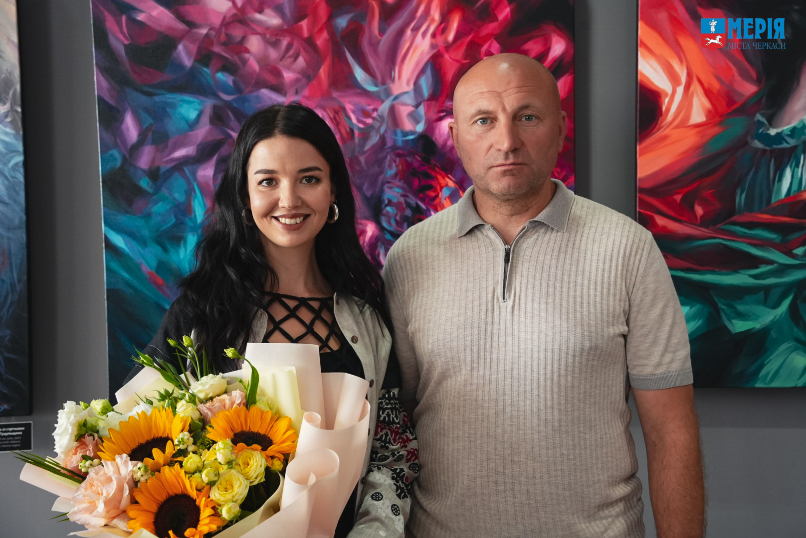 «Для нас велика честь приймати у Черкасах таку талановиту художницю. Ваші картини не лише красиві — вони глибокі та символічні. У кожній відчувається український дух 🇺🇦, зв’язок поколінь і водночас сучасність. Вражає, як через образ мотанки ви відкриваєте світові нашу культуру», — підкреслив міський голова, вручаючи мисткині 🌸 квіти та пам’ятний подарунок.