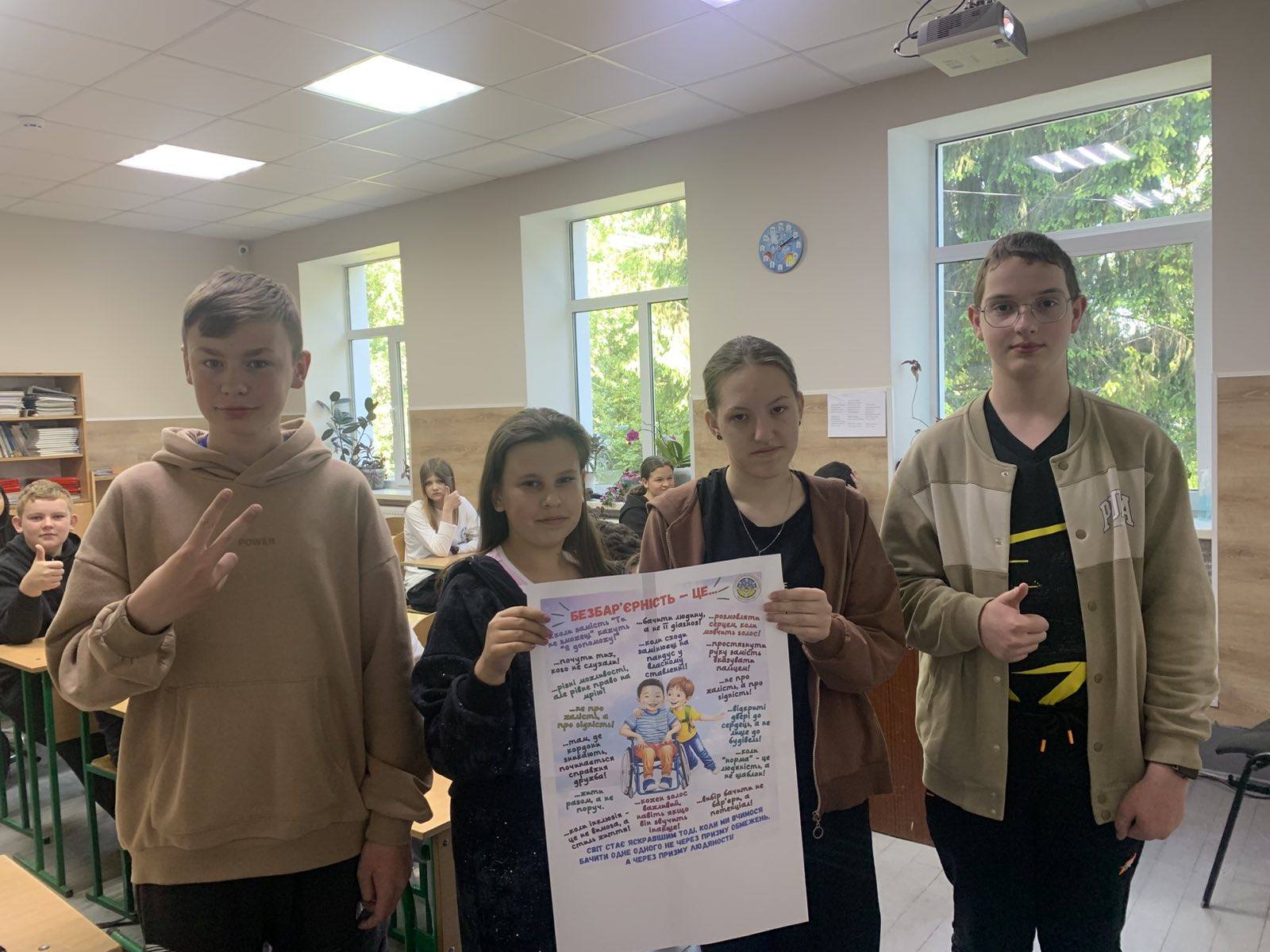 Протягом Тижня безбар’єрності було організовано та проведено численні заходи, спрямовані на підтримку інклюзії та створення безбар’єрного середовища. Учні молодших класів активно проявили свою творчість, створюючи тематичні малюнки, які відображали їхнє розуміння важливості рівності. Учні середньої та старшої школи долучилися до обговорень поняття безбар’єрності, переглядали інформаційні відеоролики та брали участь у виховних годинах, присвячених темі інклюзії. Ці заходи допомогли поглибити знання учнів про важливість створення інклюзивного суспільства.