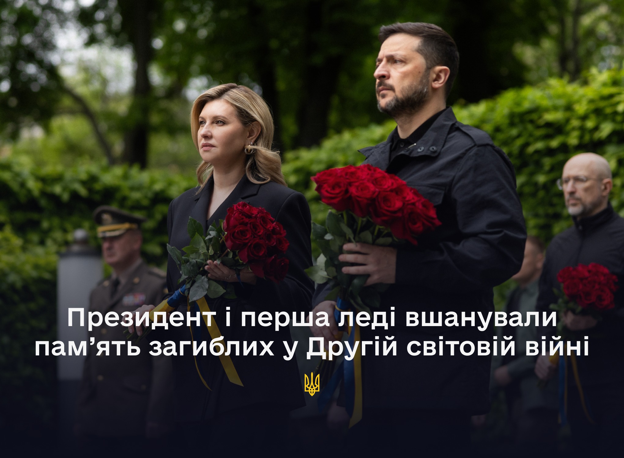 У День пам’яті та перемоги над нацизмом у Другій світовій війні 1939–1945 років Президент України Володимир Зеленський та перша леді Олена Зеленська вшанували пам’ять загиблих воїнів. Церемонія відбулася з нагоди відзначення Дня пам’яті та перемоги над нацизмом, який Україна відзначає разом з усім світом 8 травня.