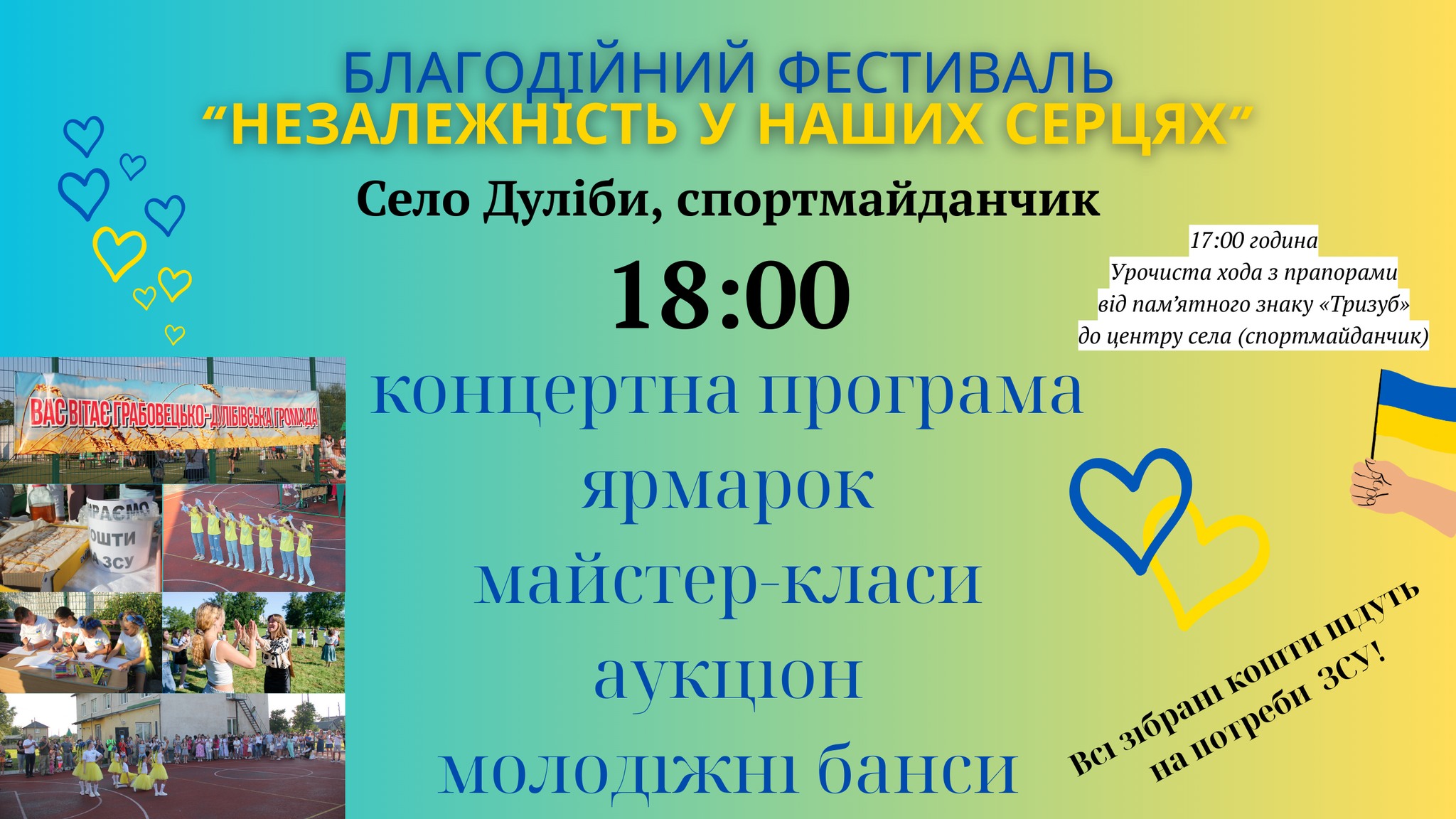 Центральною подією фестивалю буде благодійний аукціон, де будуть представлені унікальні лоти. Усі кошти, зібрані під час фестивалю, будуть спрямовані на потреби Волонтерського об’єднання «Ми з України». Це прямий внесок у підтримку наших захисників, що робить цей захід ще більш значущим. На завершення вечора на молодь чекають запальні молодіжні банси. Організатори щиро запрошують усіх жителів Грабовецько-Дулібівської громади та гостей долучитися до цього важливого свята. Відчуйте справжню єдність, підтримайте наших Захисників та разом відзначте, що Незалежність справді живе у наших серцях! Організаторами виступають КЗ «Центр культури, дозвілля і творчості Грабовецько-Дулібівської громади», КЗ Публічна бібліотека Грабовецько-Дулібівської ТГ та Грабовецько-Дулібівська дитяча школа мистецтв ім. Квітки Цісик.