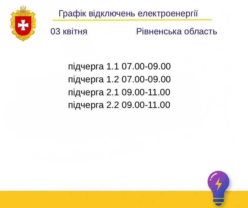 ⚡️ У зв’язку з ускладненням ситуації в енергосистемі держави Укренерго дало команду запровадити на Рівненщині у п’ятницю, 3 квітня, графік погодинних відключень електроенергії: