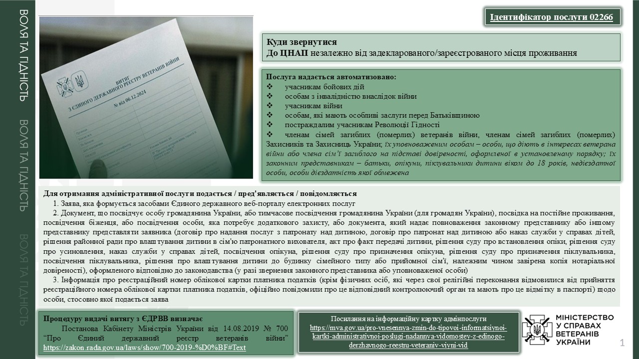 У зв’язку із внесенням зміни до Положення про Єдиний державний реєстр ветеранів війни, затвердженого постановою Кабінету Міністрів України від 14 серпня 2019 року №700, Департаментом соціальної політики оновлено інформаційно-презентаційні матеріали щодо адміністративної послуги “Надання відомостей з Єдиного державного реєстру ветеранів війни”.