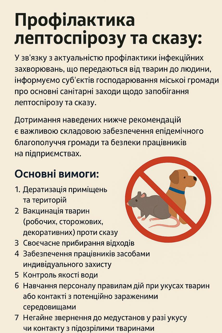 У зв’язку із нестабільною епідемічною ситуацією, в цілях попередження виникнення та поширення особливо небезпечних хвороб, зокрема сказу та лептоспірозу на території Одеської області, виконавчий комітет Чорноморської міської ради Одеського району Одеської області доводить до відома та наголошує, що дотримання профілактичних норм є обов’язковим для забезпечення санітарно-епідеміологічного благополуччя населення, захисту працівників і безпечного функціонування підприємств.