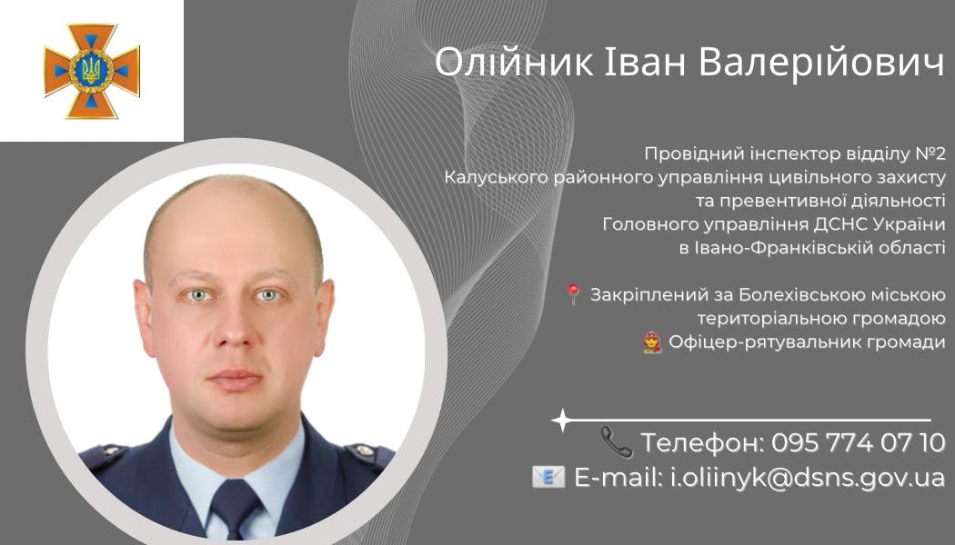У Болехівській міській територіальній громаді з’явився новий фахівець – офіцер-рятувальник Іван Валерійович Олійник. Це капітан служби цивільного захисту, провідний інспектор відділу №2 Калуського районного управління цивільного захисту та превентивної діяльності Головного управління ДСНС України в Івано-Франківській області. Це стало можливим завдяки організаційно-штатним змінам у підрозділах Державної служби України з надзвичайних ситуацій.