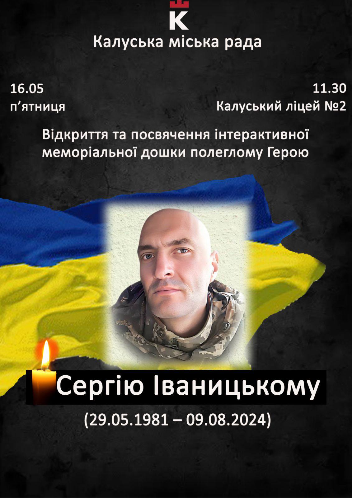 ✅16 травня на фасаді Калуського ліцею №2 відбудеться відкриття меморіальних дощок Віталію Маснову (25.03.1967 – 04.01.2024) та Сергію Іваницькому (29.05.1981 – 09.08.2024). Обидва Герої віддали своє життя за Україну, захищаючи її суверенітет і територіальну цілісність.