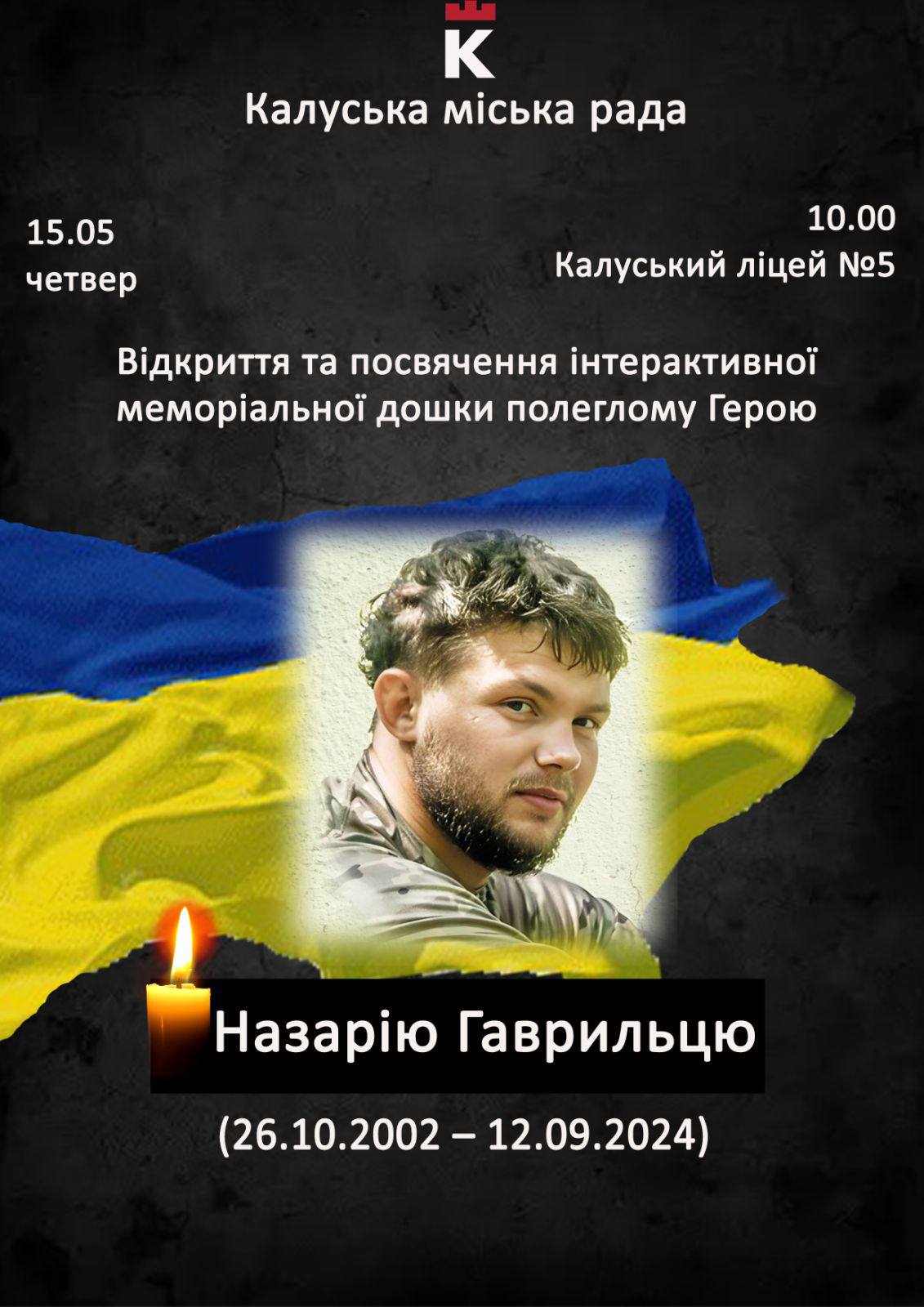 ✅15 травня о 10:00 відбудеться відкриття меморіальної дошки Назарію Гаврильцю (26.10.2002 – 12.09.2024) на фасаді Калуського ліцею №5. Назарій був випускником цього ліцею і справжнім патріотом.