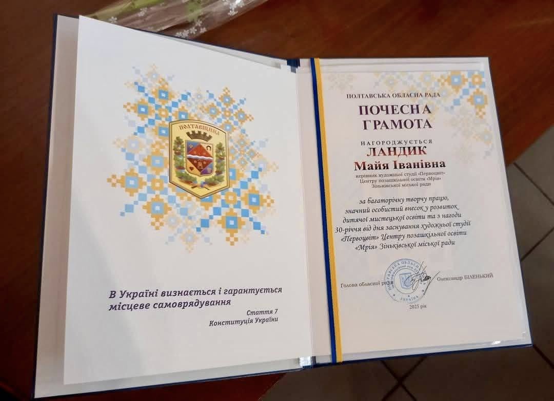 За багаторічну плідну творчу діяльність, вагомий особистий внесок у розвиток дитячої мистецької освіти, Майя Іванівна Ландик була нагороджена почесним нагрудним знаком та Почесною грамотою Полтавської обласної ради. Її талант та відданість справі отримали заслужене визнання. А її вихованці – Роман Ангелов, отримав диплом за перше місце, Ольга Бояркіна, Іванна Манойло та Микита Павленко – були відзначені дипломами за активну участь у конкурсі. Ці досягнення є результатом наполегливої праці та творчого натхнення.