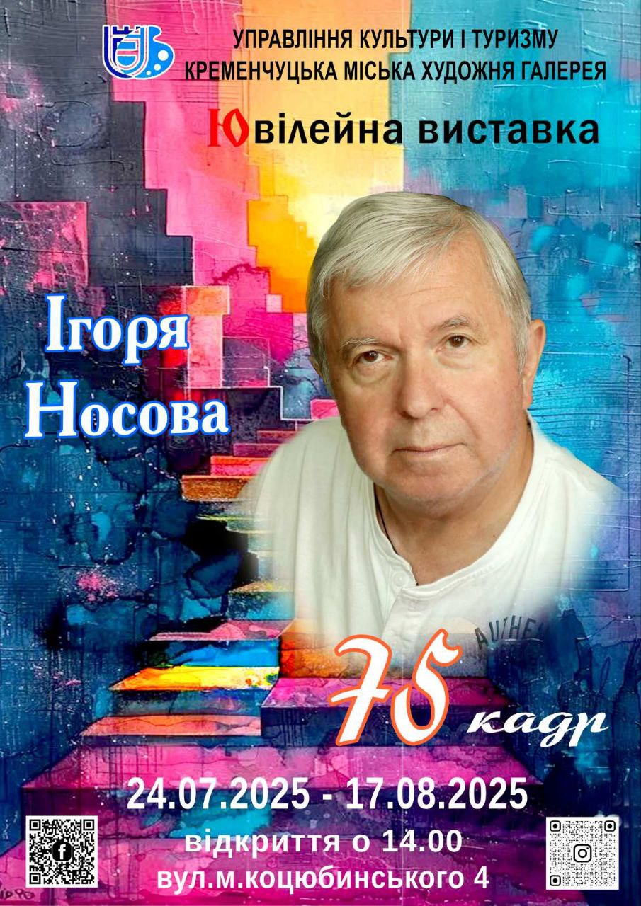 🔸 Ювілейна виставка Ігоря Носова «75 кадр» – це авторська ретроспектива видатного фотомитця, присвячена його знаменному ювілею. Ця експозиція дозволить зануритись у світ його творчості та побачити найяскравіші моменти його фотографічного шляху.