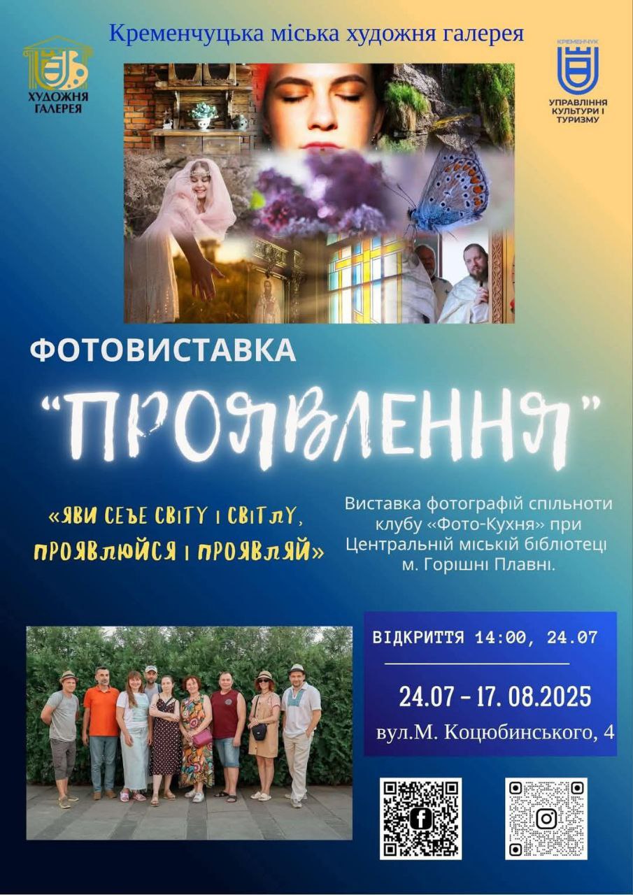 🔸 Фотовиставка «Проявлення» – це колективна експозиція робіт від спільноти клубу «Фото-Кухня» при Центральній міській бібліотеці міста Горішні Плавні. Вона несе потужне послання: «Яви себе світові, проявляйся, проявляй!» – закликаючи до самовираження та відкритості.