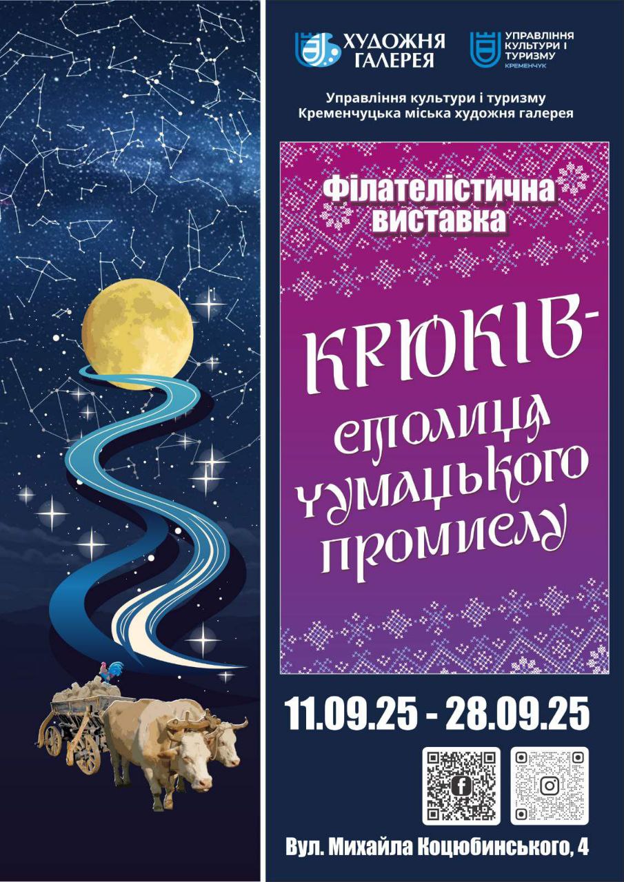 🔸 Другою родзинкою стане філателістична виставка «Крюків — столиця чумацького промислу». Цей унікальний проєкт розкриває багату історію Крюкова крізь призму поштових марок та конвертів. Відвідувачі матимуть нагоду зазирнути в минуле міста, згадати про його славне культурне минуле, пов’язане з чумацькими часами, та оцінити важливість колекціонування як способу збереження історичної пам’яті. Це чудова нагода для всіх, хто цікавиться історією рідного краю.