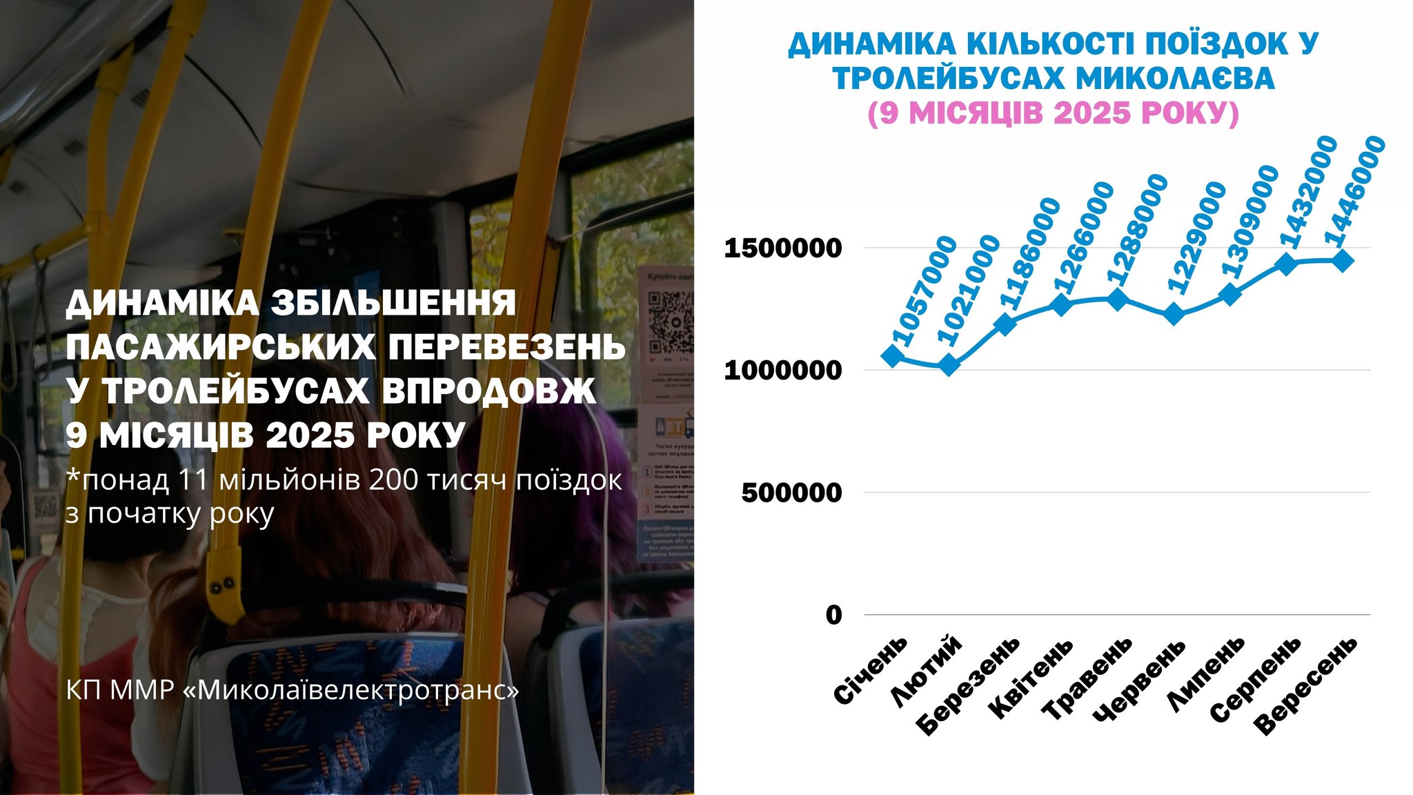 Миколаїв демонструє позитивну динаміку у сфері громадського транспорту, зокрема, зростає кількість пасажирських перевезень тролейбусами. Від початку поточного року було здійснено понад 11 мільйонів 200 тисяч поїздок у миколаївських тролейбусах. Ця тенденція свідчить про підвищення довіри мешканців до цього екологічно чистого виду транспорту.