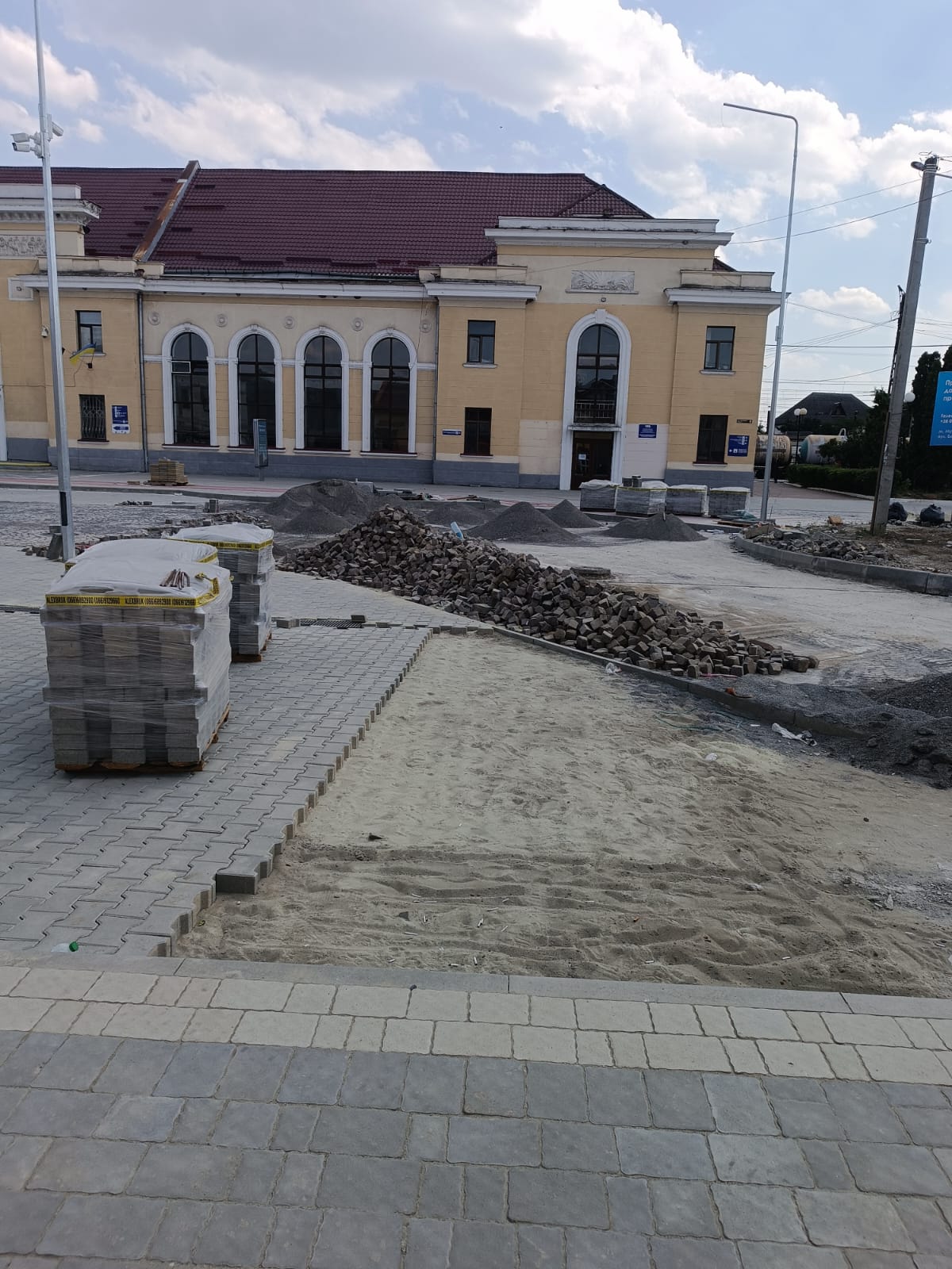 Наразі підрядна організація проводить влаштування бетонної плити з армуванням сіткою. Також виконуються роботи з облаштування ФЕМ-покриття для пішоходів та велодоріжки біля головного входу вокзалу та мощення бруківки біля проїжджої частини.