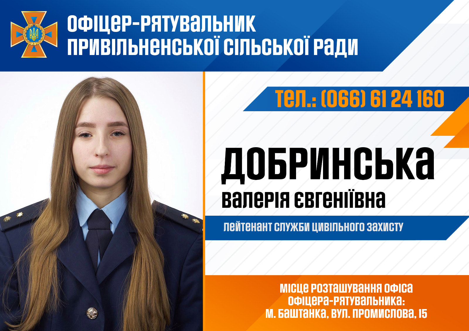 👨🚒 Новий офіцер-рятувальник розпочав роботу в нашій громаді задля підвищення рівня безпеки мешканців. Лейтенант служби цивільного захисту ДОБРИНСЬКА Валерія Євгеніївна офіційно призначена на посаду офіцера-рятувальника, що обслуговуватиме як Привільненську, так і Інгульську громади. Її ключова місія – невпинно працювати над тим, щоб наше з вами життя стало значно безпечнішим.