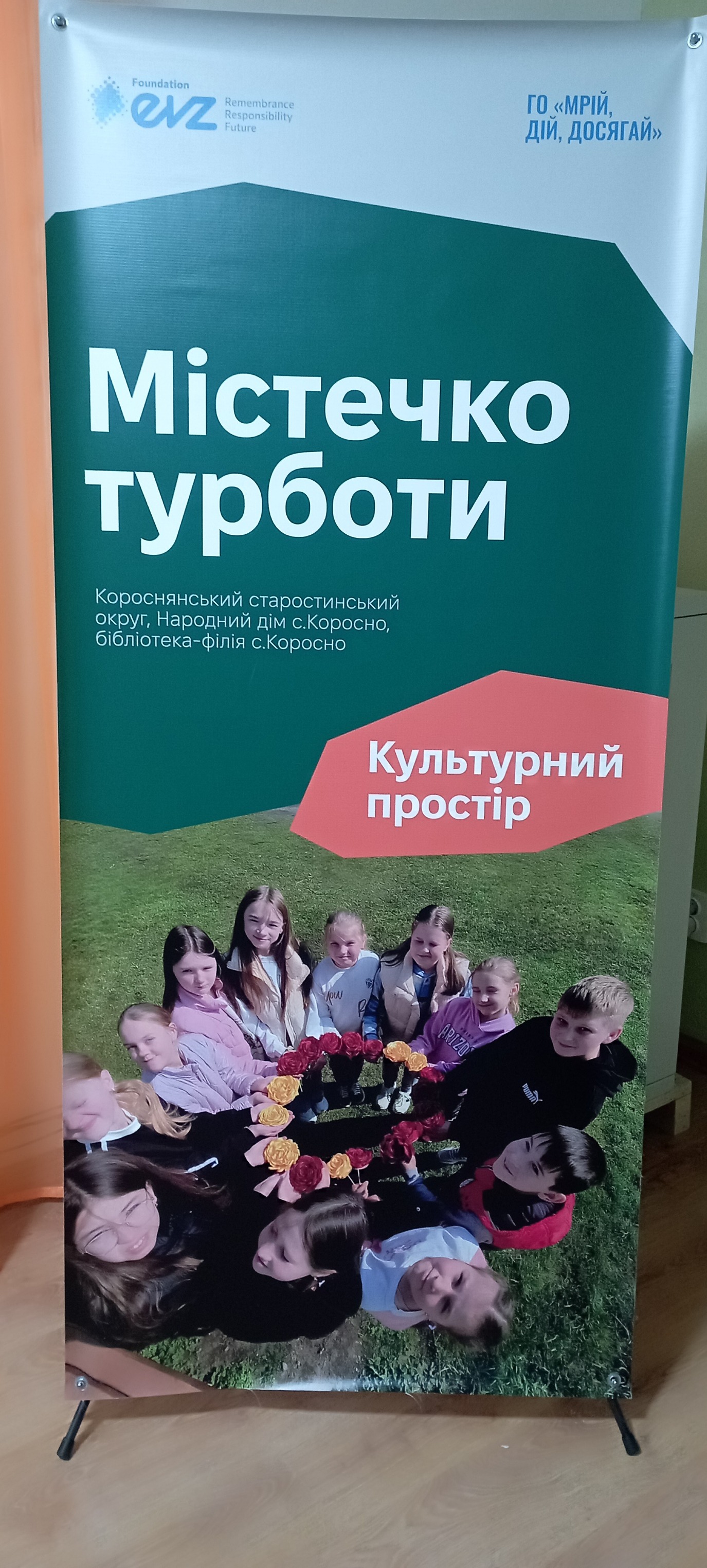 «Містечко турботи» швидко перетворилося на улюблене місце зустрічей, спілкування та розвитку для мешканців Коросна. Тут проходять гурткові заняття, творчі вечори та інші цікаві заходи, що збагачують культурне життя громади. Створення цього простору стало можливим завдяки фінансовій підтримці програми #ЄМістечко – простір для кожного в Україні» #EVZgefördert Фонду «Пам’ять, відповідальність і майбутнє» та Громадської організації “Мрій, дій, досягай”, які підтримують проєкти, спрямовані на розвиток соціальної згуртованості та підтримки у важкі часи.