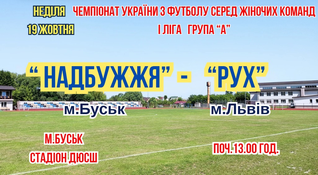 ⚽️ У неділю, 19 жовтня, на футбольному полі Буської ДЮСШ відбудеться захопливий поєдинок VI туру Чемпіонату України з футболу сезону 2025/2026 серед жіночих команд. Це гра Першої ліги, Група А, яка обіцяє бути напруженою та цікавою. На полі зійдуться команди: ЖФК «Надбужжя» (м. Буськ) та ЖФК «РУХ» (м. Львів).