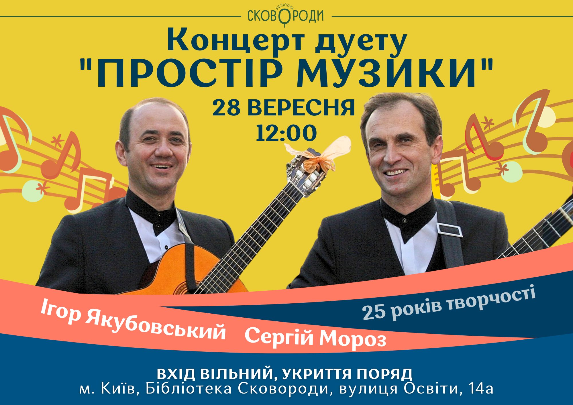 ✨ У неділю, 28 вересня о 12:00, у читальній залі Центральна бібліотека Солом’янки імені Григорія Сковороди відбудеться концерт дуету “Простір музики” – Ігор Якубовський та Сергій Мороз.
