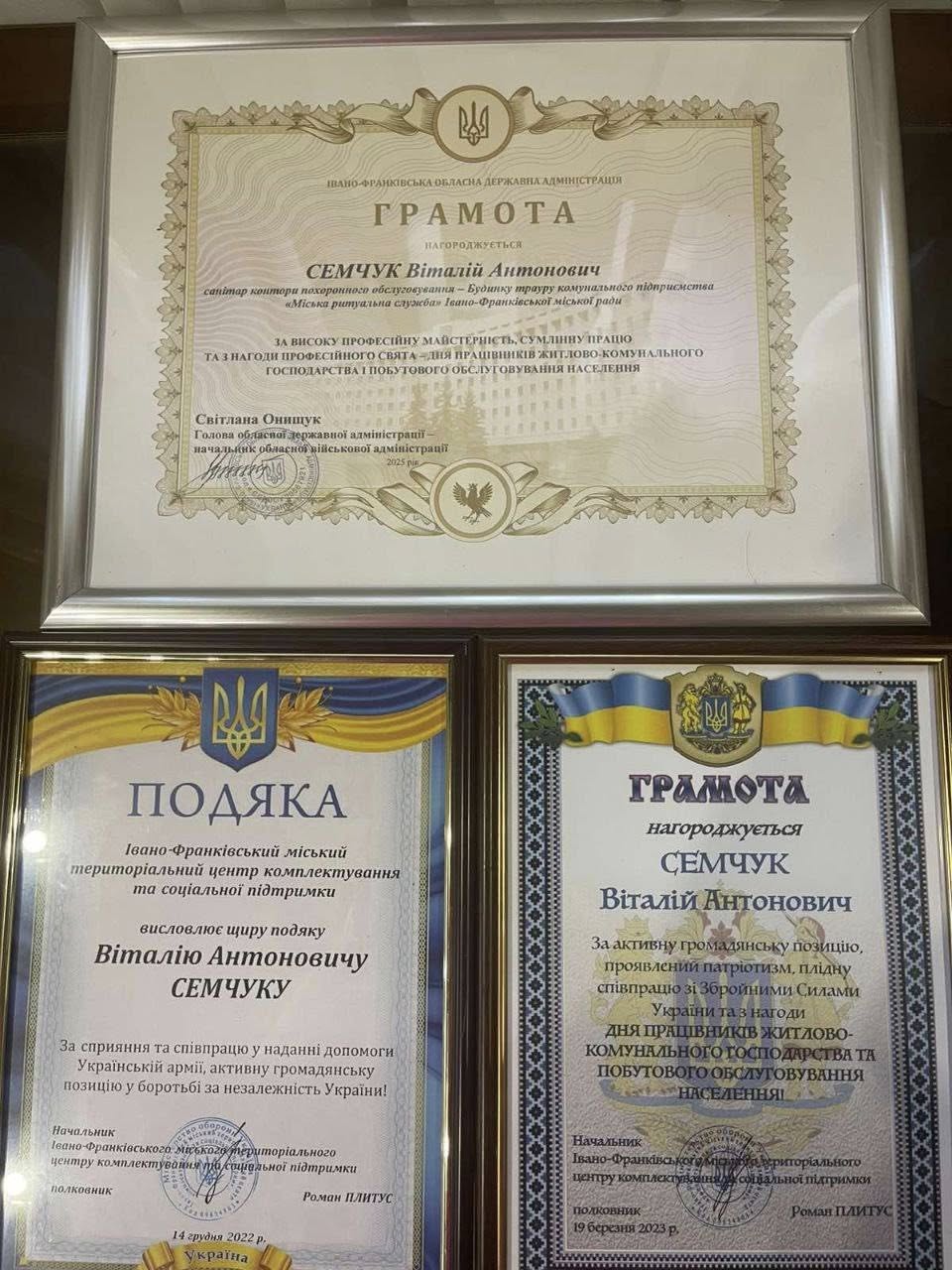Віталій Семчук, що працює в Домі скорботи на вулиці Ребета в місті Івано-Франківську, вже давно став опорою для сотень родин. Обертинська селищна рада, а також численні мешканці громади, неодноразово зверталися до Віталія Антоновича, знаючи про його професіоналізм та, що найважливіше, неперевершену людяність. Він завжди виявляє глибоке розуміння, підтримує та допомагає у найскладніших життєвих ситуаціях. Його небагатослівність та мовчазність, поєднані зі смутком в очах, свідчать про те, що він переживає біль кожної родини, що до нього звертається.