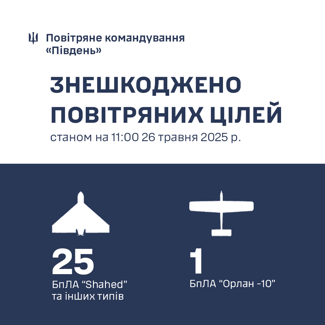 Одеса, 26 травня 2025 – Вночі 26 травня 2025 року, завдяки ефективній роботі підрозділів протиповітряної оборони на півдні України, в Одеській області було успішно знешкоджено 25 ворожих ударних БпЛА типу «Shahed», а також інші типи безпілотних літальних апаратів. Це важливий успіх у захисті регіону від повітряних атак.