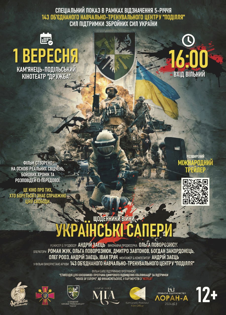 🇺🇦 З нагоди 5-ї річниці створення 143-го Об’єднаного навчально-тренувального центру «Поділля» Сил підтримки Збройних сил України, запрошуємо всіх бажаючих на унікальний кінопоказ. Ми покажемо фільм «Українські сапери. Щоденники війни», створений талановитим режисером Андрієм Зайцем. Ця кінострічка – це не просто документальний фільм, це глибоке занурення у 20-річну історію центру, який першим в Україні розпочав спеціалізовану підготовку саперів та розмінування. Від самого заснування, через участь у важливих миротворчих місіях, протистояння на АТО/ООС і аж до найтяжчих днів повномасштабної війни – все це знайшло своє відображення на екрані. Фільм базується на реальних свідченнях наших героїв, бойових хроніках та безпосередніх розповідях із передової. Це справжнє кіно про тих, хто невтомно бореться за нашу свободу і знає її справжню, часом надто високу, ціну. Приєднуйтесь до нас 1 вересня 2025 року о 16:00 у кам’янець-подільському кінотеатрі «Дружба», розташованому за адресою: вул. Лесі Українки, 20. Вхід на показ вільний для всіх, хто шанує пам’ять та подвиг наших захисників. Це чудова нагода віддати шану праці українських саперів. #УкраїнськіСапери #UkrainianSappers #DiariesOfTheWar #ЩоденникиВійни #УкраїнськеКіно #ДокументальнийФільм #KamianetsPodilskyiFilmOffice #КамянецьПодільський #ПОДІЛЛЯ