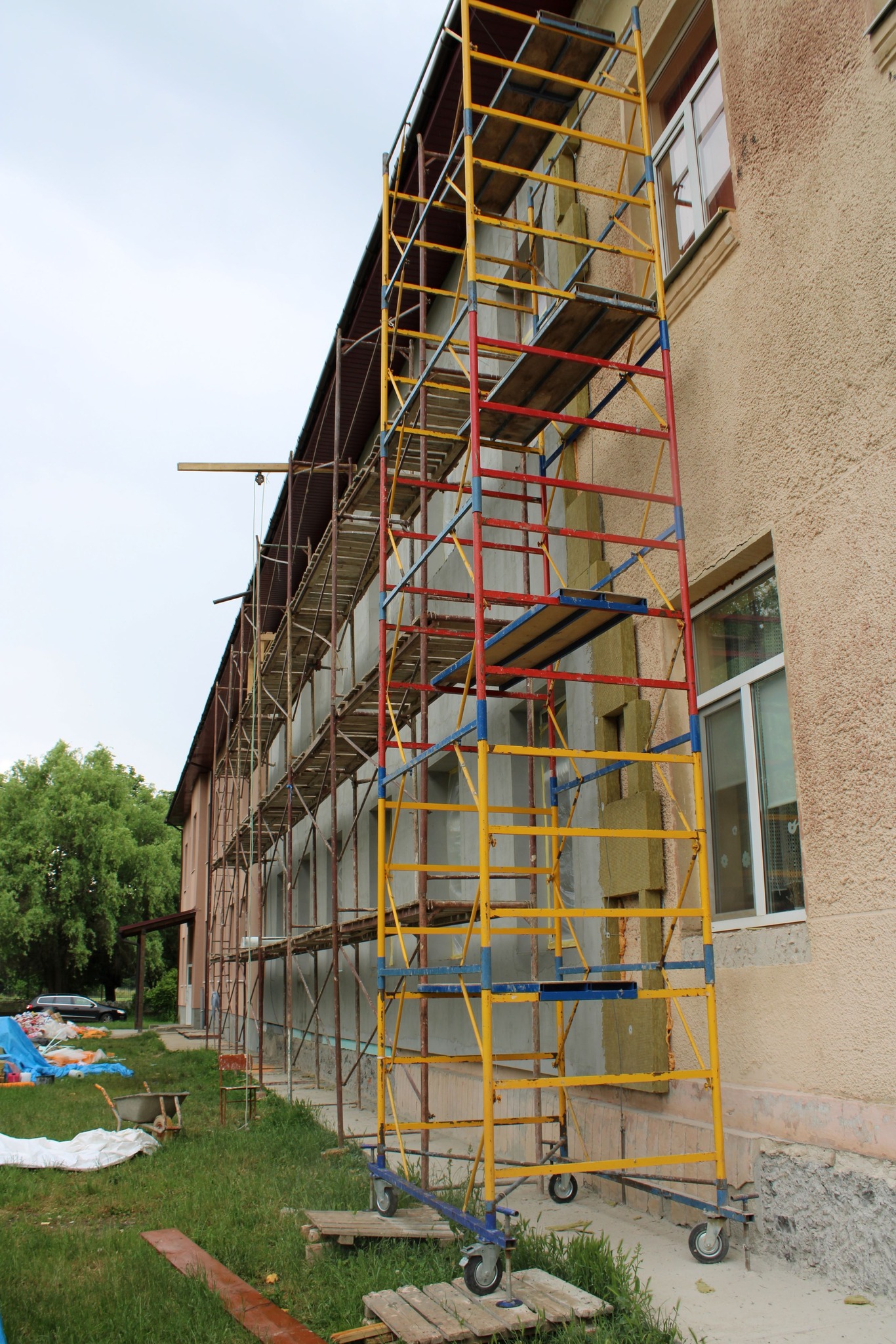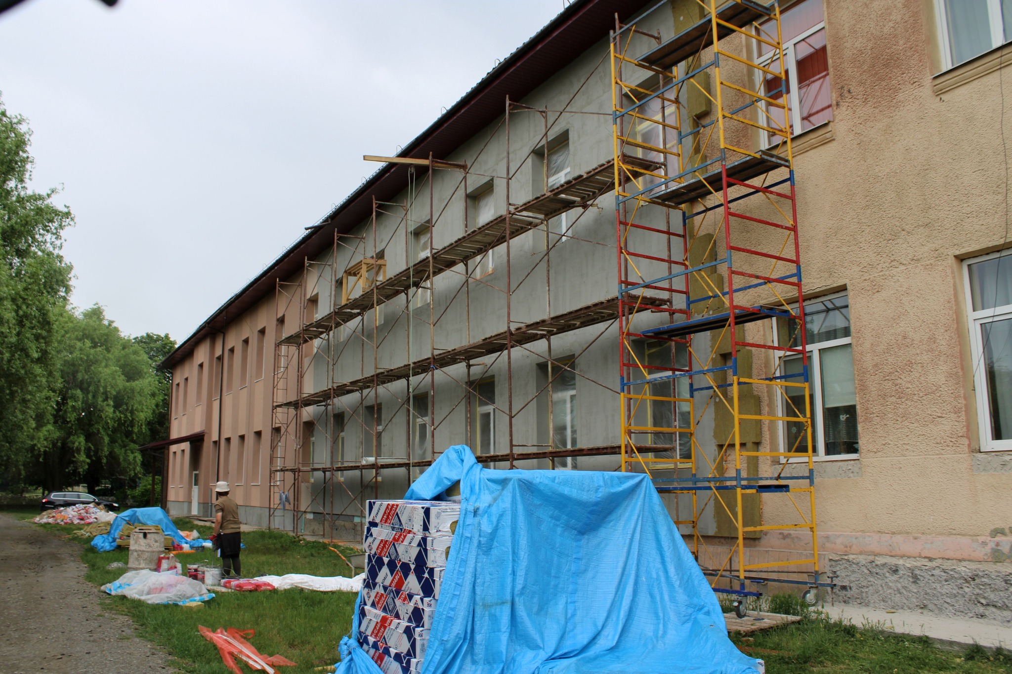 У рамках проведення капітального ремонту фасаду будівлі Чопського ліцею імені Іштвана Сечені продовжується утеплення і фарбування стін закладу.