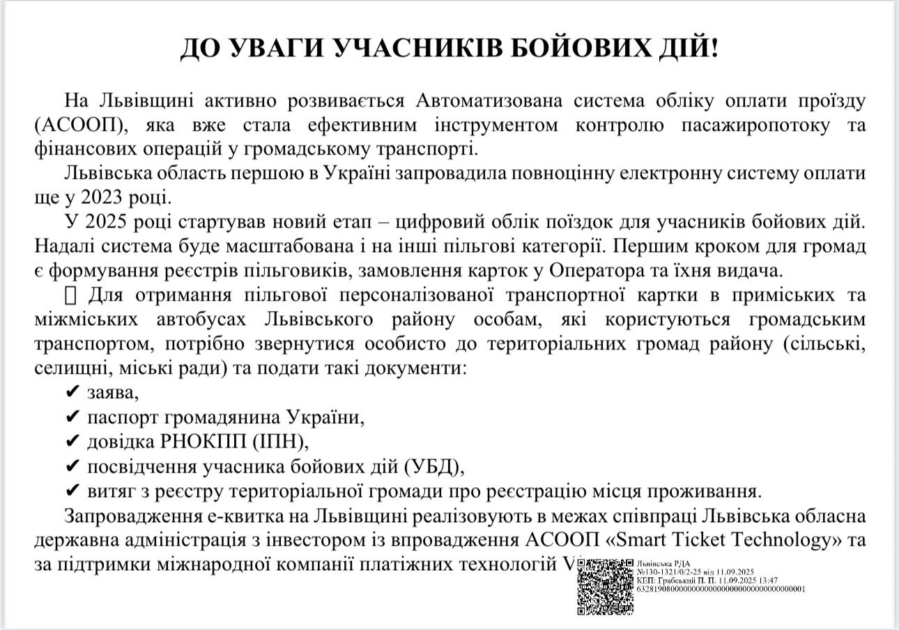 ‼️ Триває впровадження пілотного проєкту щодо компенсації пільгового проїзду окремих категорій громадян у пасажирському транспорті на Львівщині. Ця ініціатива реалізується районною державною адміністрацією спільно з Управлінням транспорту Департаменту дорожнього господарства Львівської обласної військової адміністрації. Оператором Автоматизованої системи обліку оплати проїзду (АСООП) на приміських та міжміських автобусних маршрутах області виступає ТОВ «Smart Ticket Technology».
