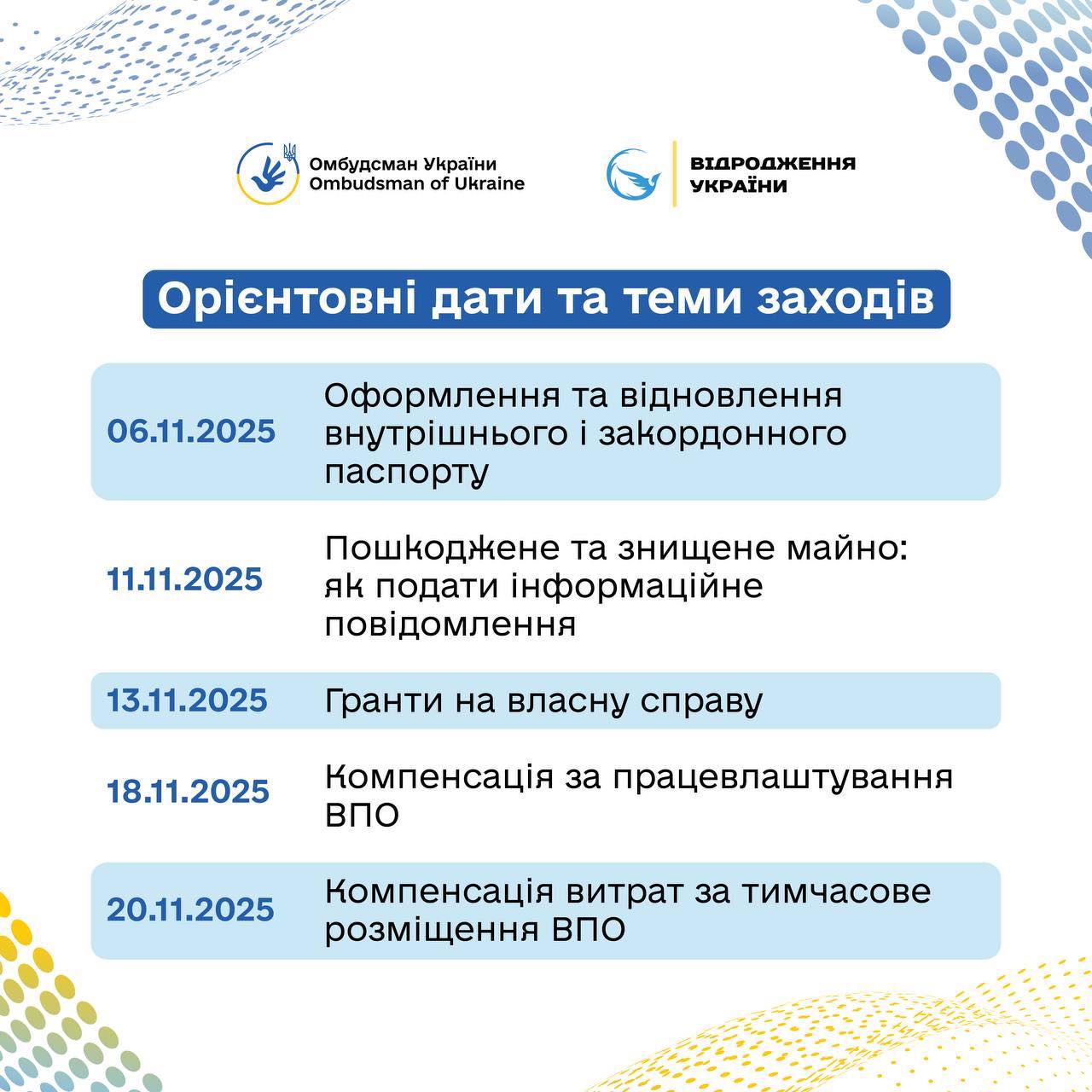 Заплановано проведення вебінарів для внутрішньо переміщених осіб (ВПО) та тих, хто постраждав від збройної агресії проти України. Ця ініціатива є результатом співпраці Секретаріату Уповноваженого Верховної Ради України з прав людини та громадської організації «Відродження України 2022», за активної підтримки Офісу Ради Європи в Україні. Ці вебінари мають на меті надати необхідну підтримку та ресурси для осіб, які пережили травматичні події війни та вимушені були покинути свої домівки.
