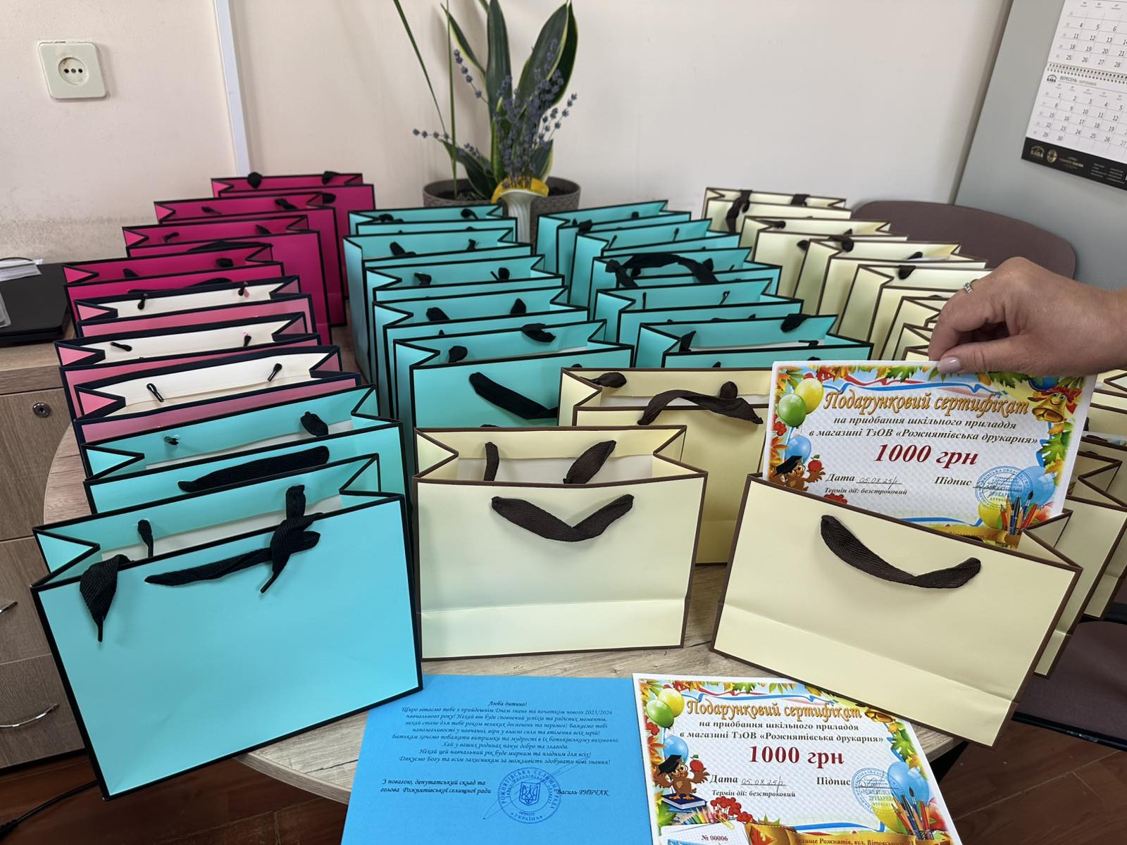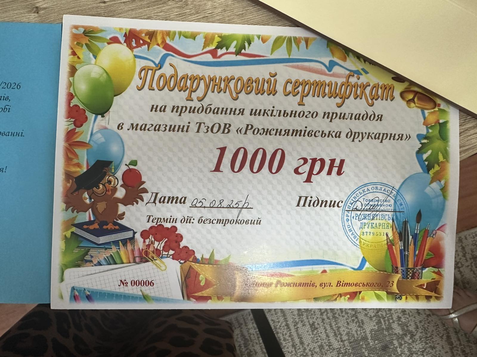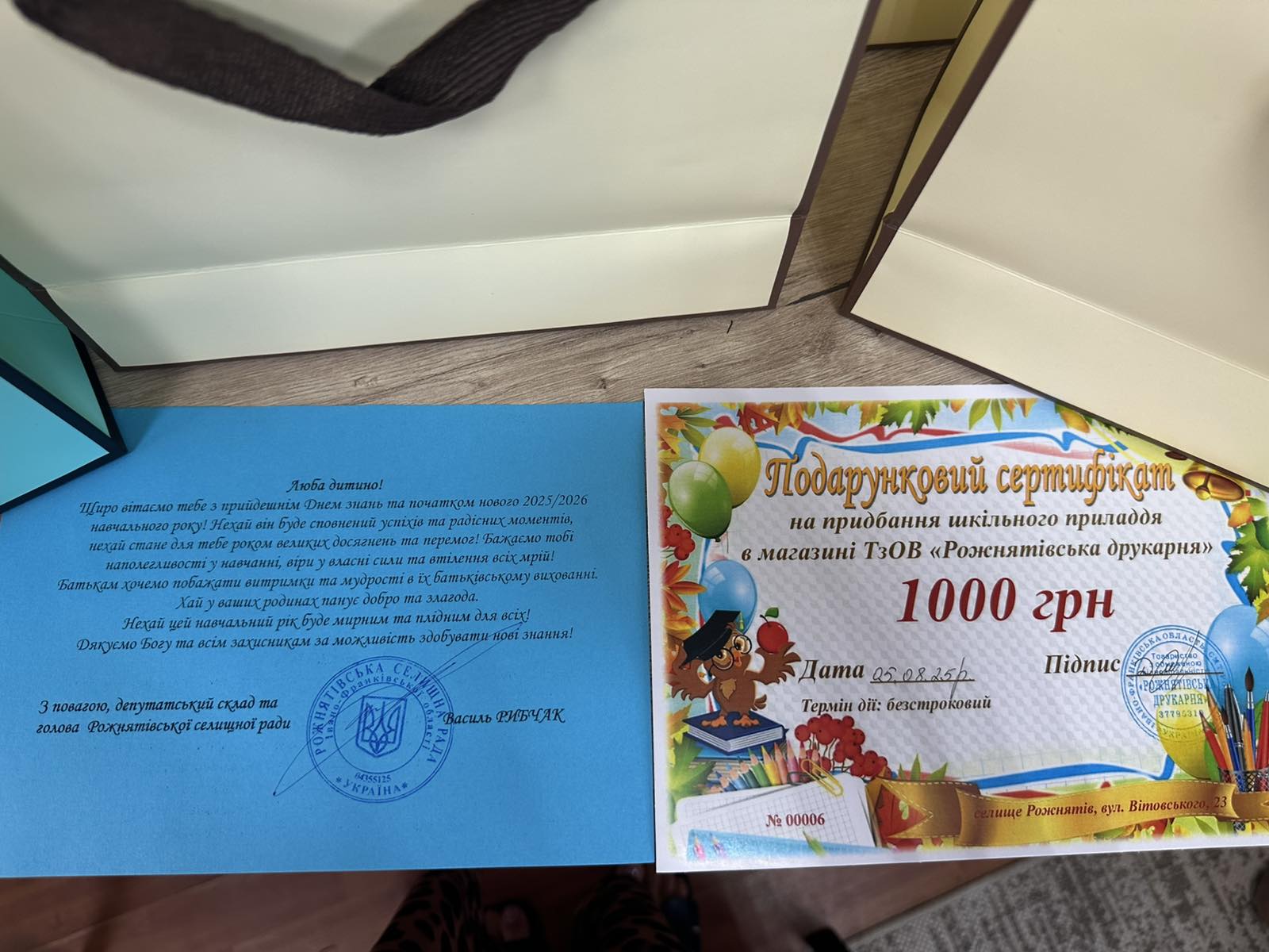 У рамках **цільової Програми соціального захисту і підтримки дітей на 2025-2029 роки** Служба у справах дітей Рожнятівської селищної ради закупила подарункові сертифікати вартістю 1000 грн на придбання канцтоварів для шкільного портфелика. 36 діток з сімей уразливих категорій (діти-сироти, діти полеглих захисників, діти із сімей, що опинилися в СЖО) зможуть наповнити свій шкільний портфелик усім необхідним для навчання.
