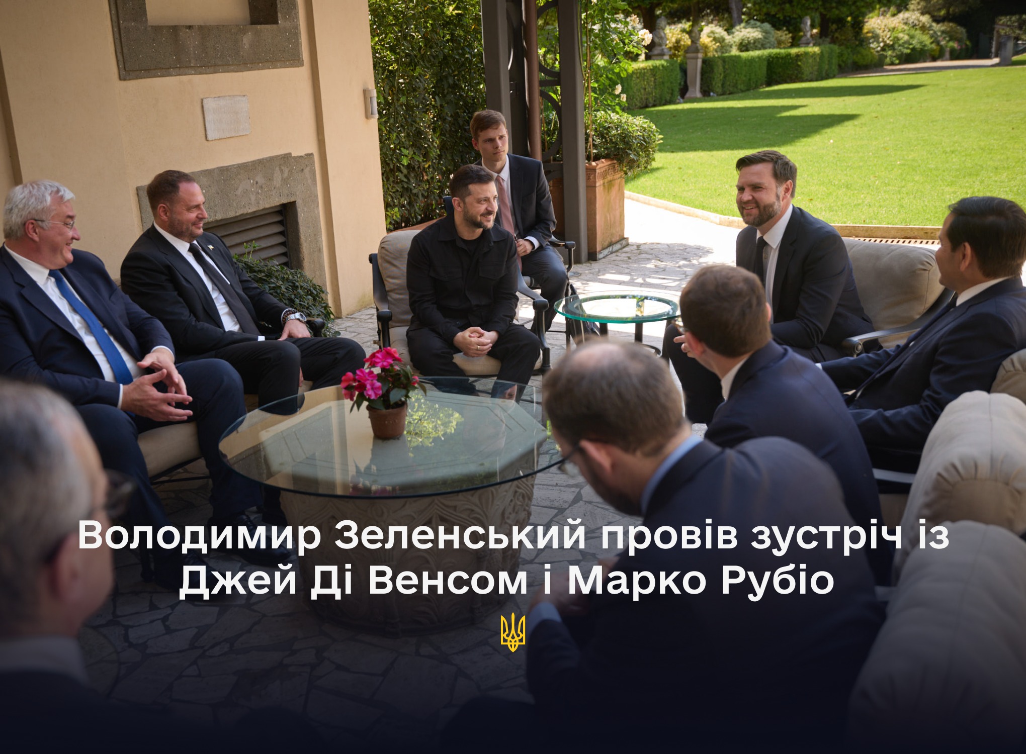Президент України Володимир Зеленський провів важливу зустріч у Римі з віцепрезидентом Сполучених Штатів Америки Джей Ді Венсом і держсекретарем США Марко Рубіо, який також виконує обов’язки радника Президента Сполучених Штатів з питань національної безпеки. Ця зустріч підкреслює важливість стратегічного партнерства між Україною та США у підтримці суверенітету та безпеки України.