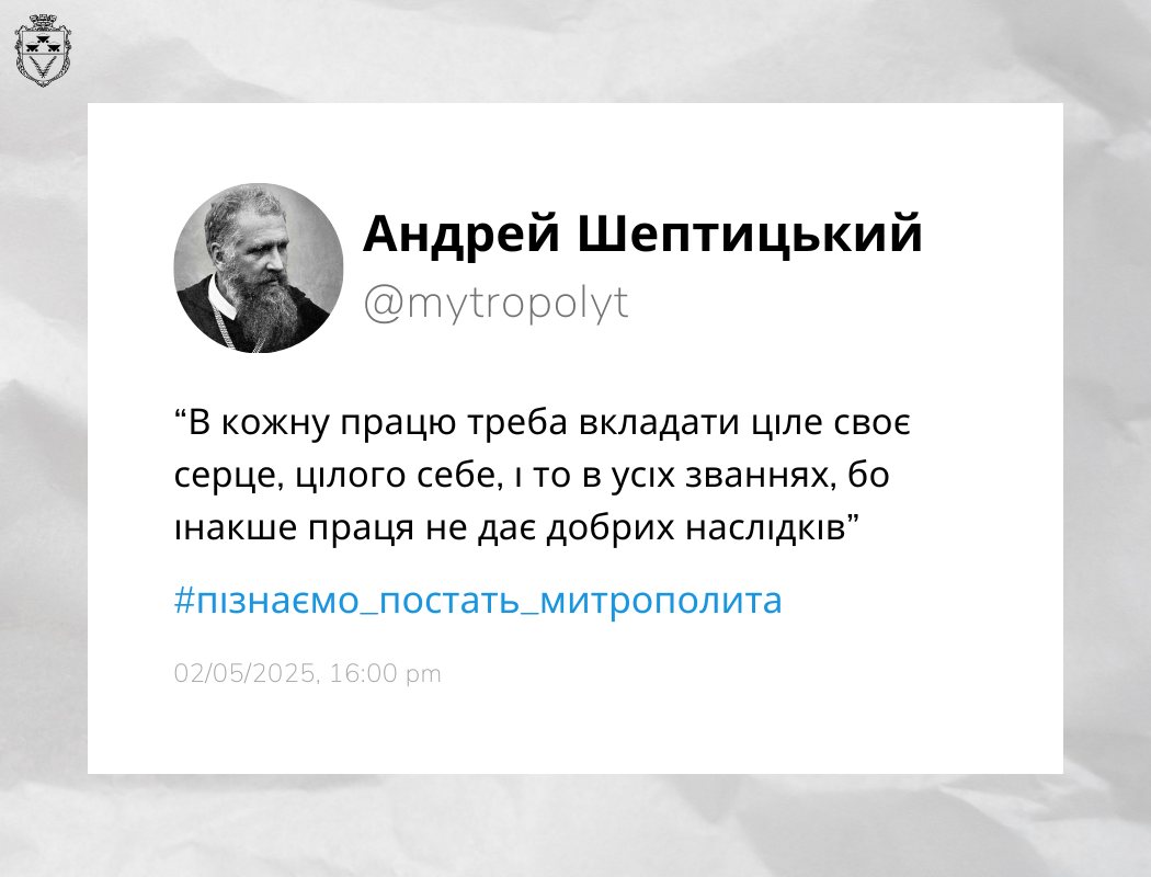 Слова митрополита не втрачають своєї актуальності і сьогодні, нагадуючи нам про милосердя й добро, віру, любов до ближнього та служіння Україні.