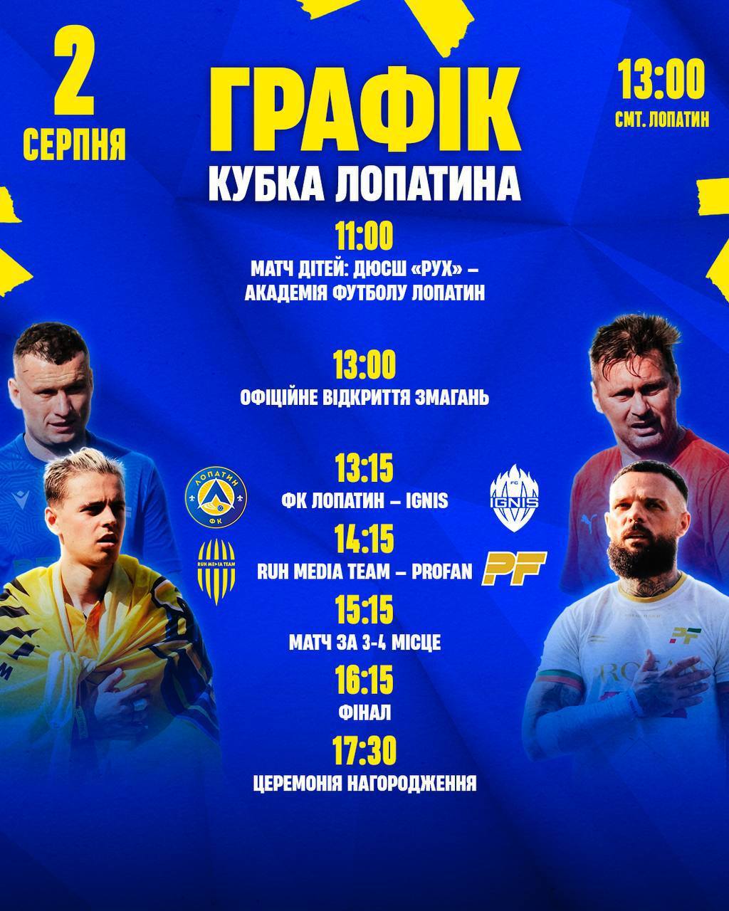 😍🔥 У селищі Лопатин відбудеться грандіозне футбольне свято – КУБОК ЛОПАТИНА, що поєднує спортивні баталії та медіа-футбол. За перемогу змагатимуться чотири команди: «Ігніс», «Профан», «Рух медіа тім» та «ФК Лопатин».
