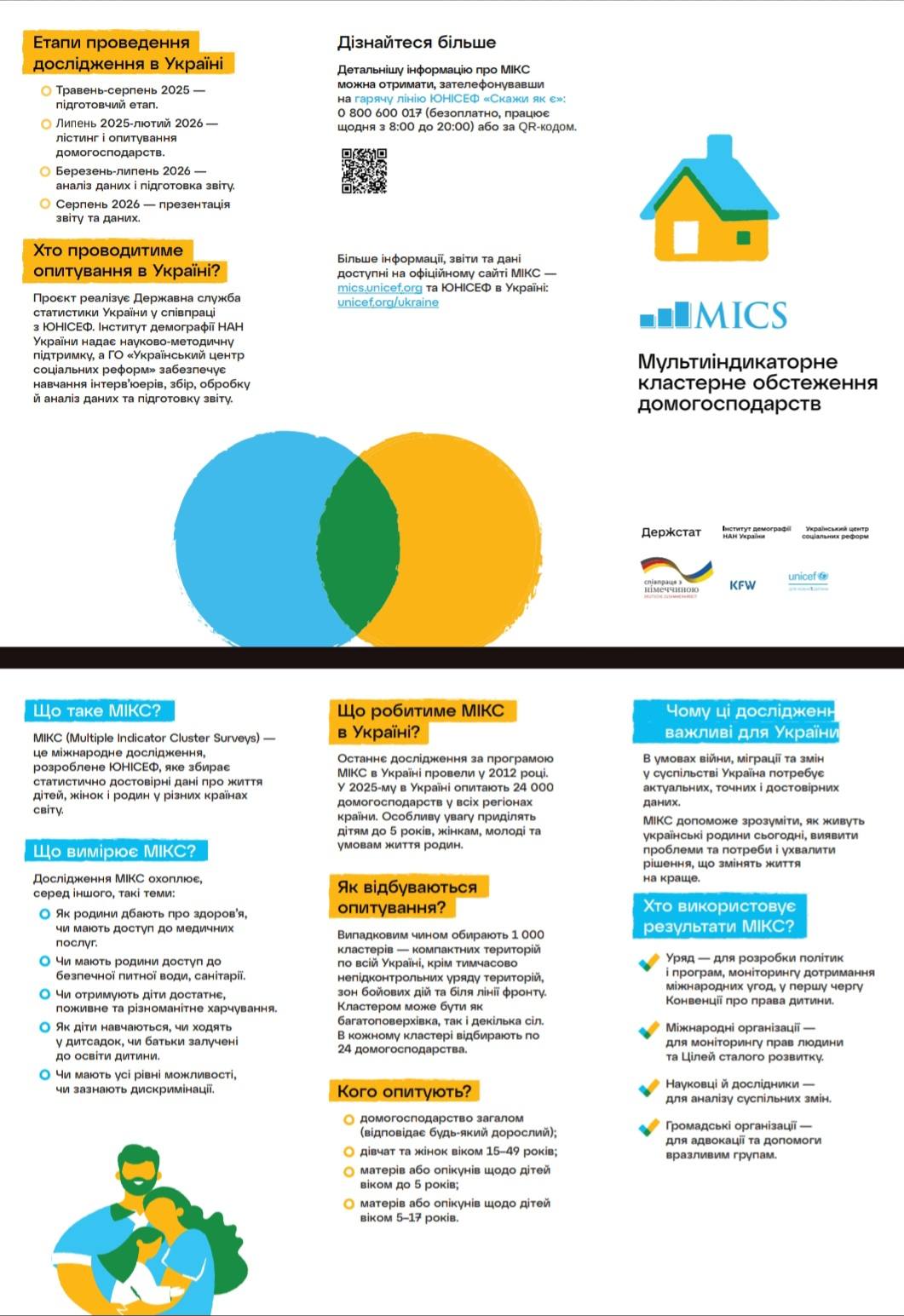 У 2025–2026 роках в Україні проводиться черговий раунд Мультиіндикаторного кластерного обстеження домогосподарств (MICS), що реалізується Державною службою статистики України спільно з Інститутом демографії та соціальних досліджень ім. М. В. Птухи НАН України та ГО «Український центр соціальних реформ», за підтримки Дитячого фонду ООН (ЮНІСЕФ).