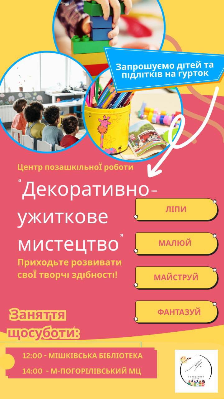 Заняття декоративно-ужитковим мистецтвом у Мішково-Погоріловому – це не просто хобі, а інвестиція в гармонійний розвиток дитини. Ми переконані, що кожна дитина має творчий потенціал, і наше завдання – допомогти йому розкритися. Приєднуйтесь до нашого творчого колективу, де чекають на вас нові відкриття та яскраві емоції! 🎨💫