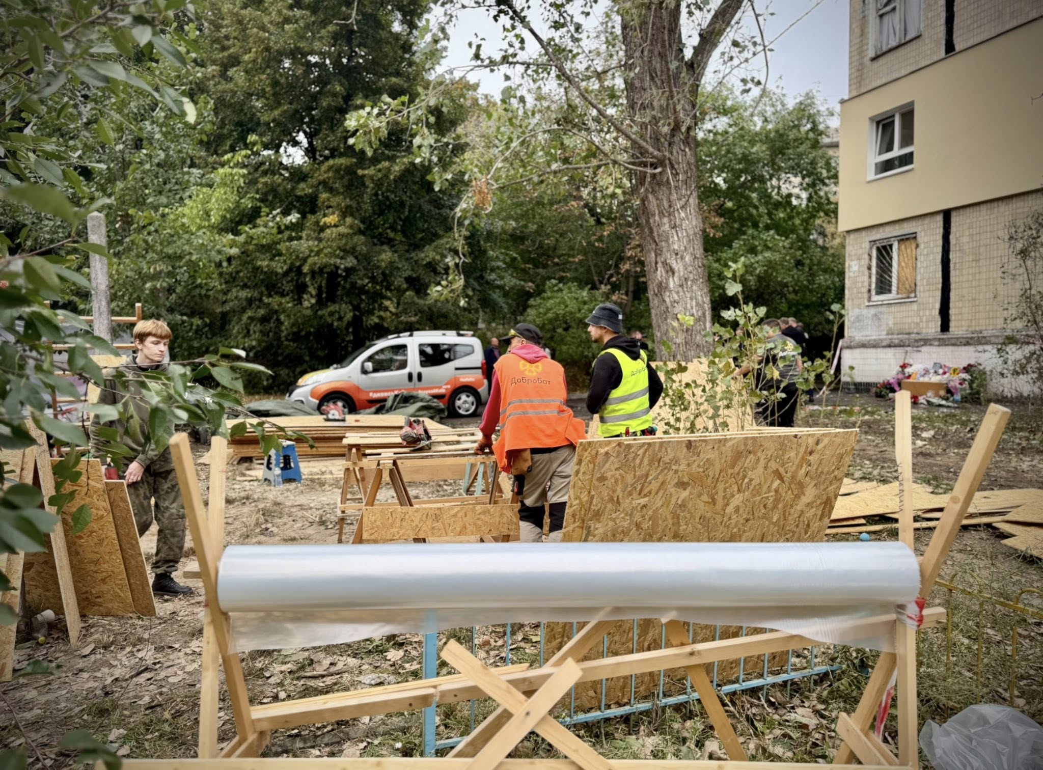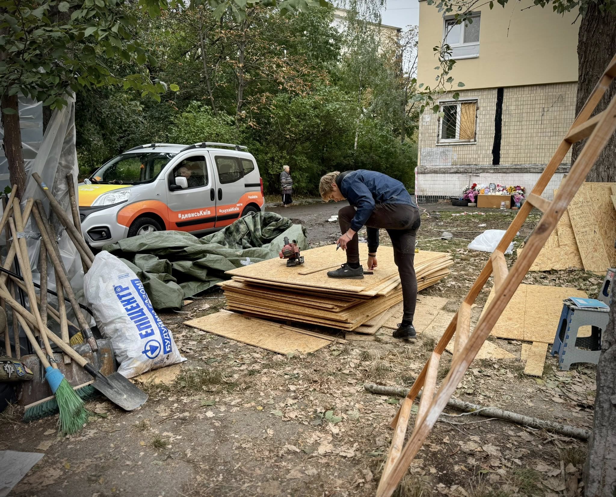 У Солом’янському районі другий день поспіль тривають роботи з ліквідації наслідків останнього комбінованого обстрілу. Комунальні служби прибирають уламки, закривають вибиті вікна, відновлюють воду й електрику. Соціальні працівники приймають постраждалих мешканців, допомагають з оформленням документів і пояснюють, як скористатися міськими та державними програмами підтримки.