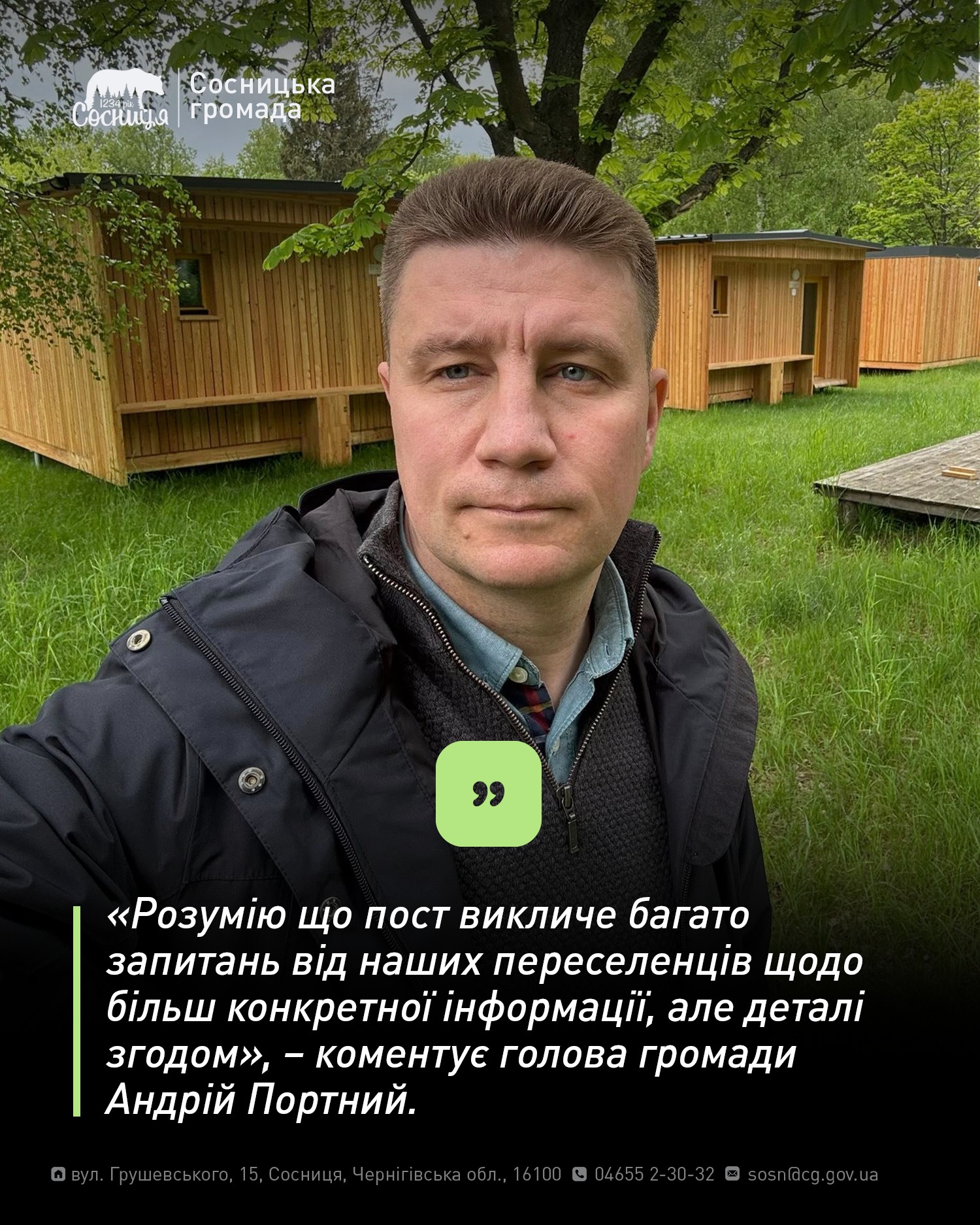 Очільник громади, Андрій Портний, зазначив: «Розумію, що цей пост викличе чимало запитань від наших переселенців щодо більш конкретної інформації, але всі деталі будуть надані згодом». Він запевнив, що найближчим часом буде оприлюднено детальну інформацію про умови проживання та порядок отримання тимчасового житла.