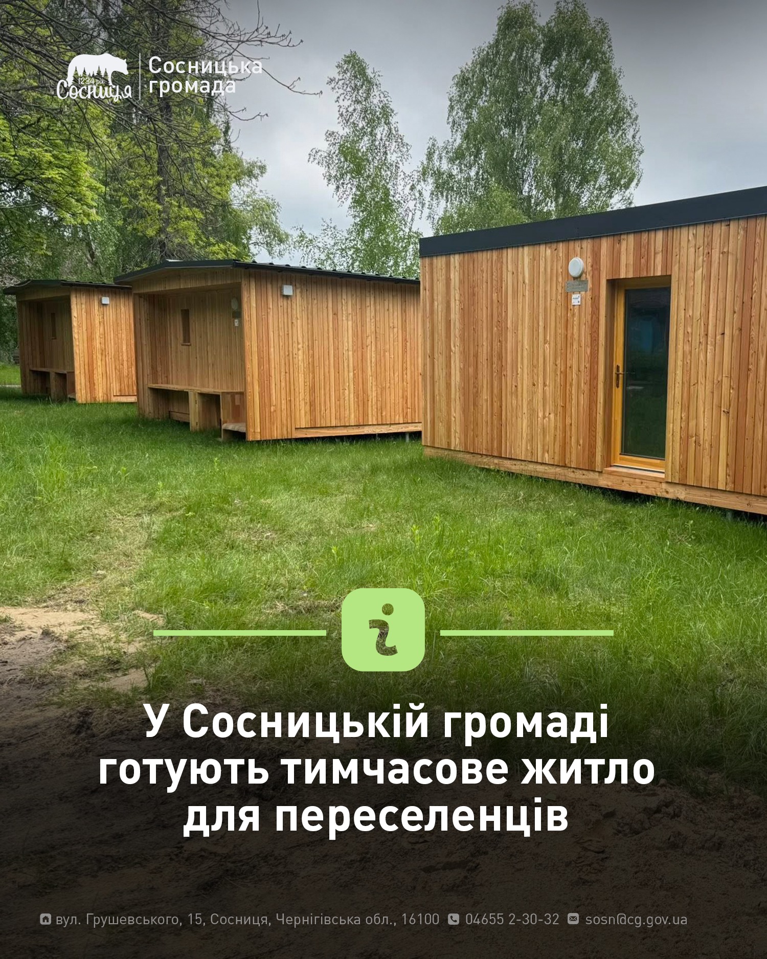 У Сосницькій громаді активно триває підготовка тимчасового житла для внутрішньо переміщених осіб. Перші три модульні будиночки вже встановлено, і вони обладнані всіма необхідними зручностями для комфортного проживання. Кожен будиночок підключено до систем водопостачання, водовідведення та електропостачання. Внутрішній простір укомплектовано меблями, передбачено місце для приготування їжі та прання.