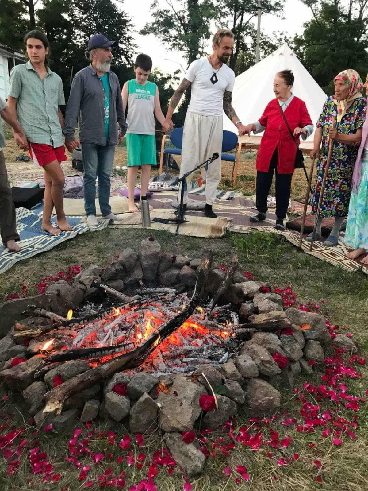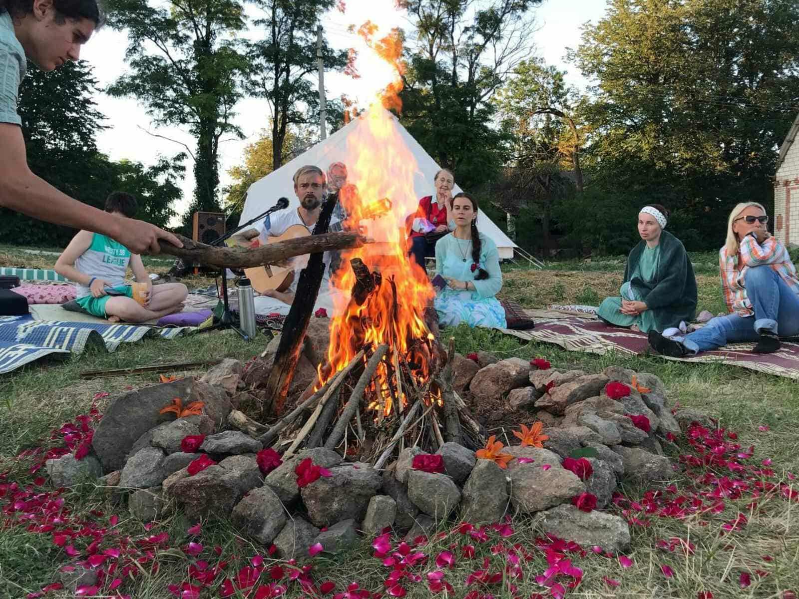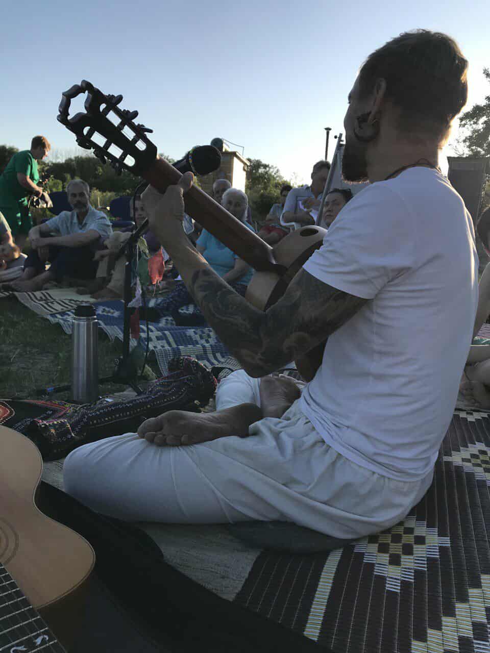Музичний вечір пройшов просто неба, коли сонце вже сідало за горизонт, зменшивши денну спеку. Об’єднавшись у коло навкруг прикрашеного костровища, сидячи, хто на стільцях, а хто на подушках та килимках , учасники під звуки гітари та флейти співали разом прості за словами, проте глибокі за змістом пісні: