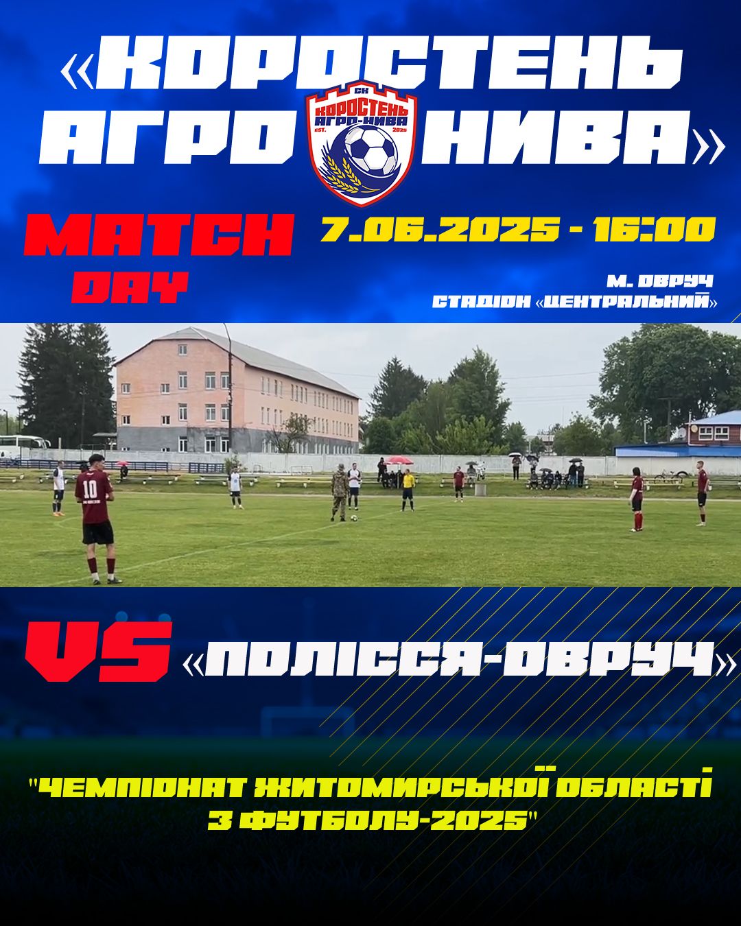 У суботу, 7 червня, о 16:00 на стадіоні “Центральний” в Овручі відбудеться захопливий матч 4 туру Чемпіонату Житомирської області з футболу! Не пропустіть цю важливу подію для місцевих вболівальників та всіх шанувальників футболу.