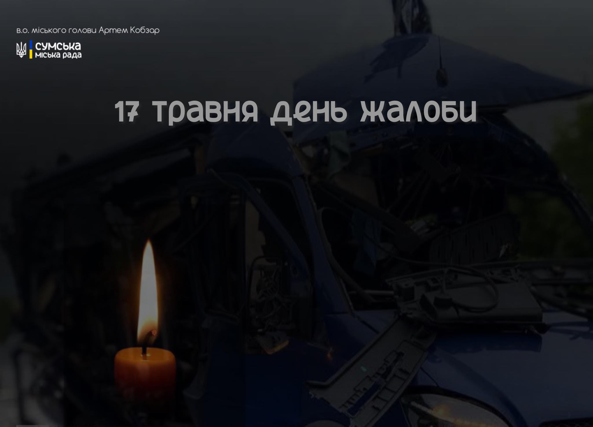 🕯️У зв’язку з трагічною подією, що сталася поблизу Білопілля, внаслідок якої загинули 9 людей, у Сумській громаді оголошено День жалоби 17 травня. Ця страшна трагедія глибоко вразила всю громаду, і ми разом розділяємо біль втрати з родинами загиблих. День жалоби – це час, коли ми зупиняємося, щоб вшанувати пам’ять тих, хто відійшов у вічність, і підтримати тих, хто залишився.