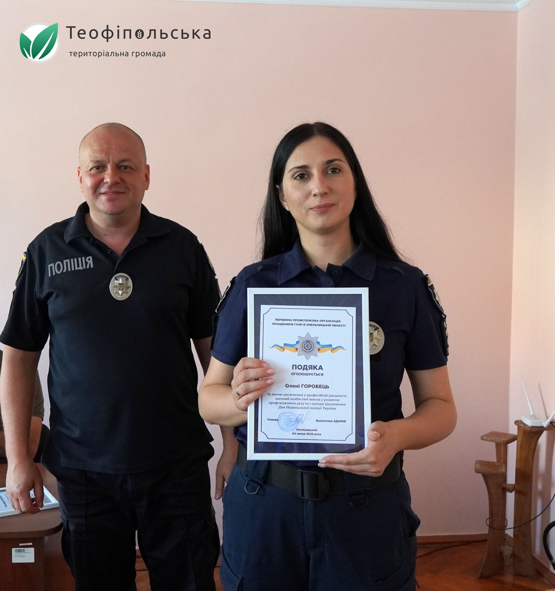 У ході урочистостей Роман Непотас особисто вручив Грамоти селищної ради двом відзначеним співробітникам: старшому лейтенанту поліції Войтовичу Сергію Вікторовичу, інспектору з реагування патрульної поліції СПД №1 ВП №2 Хмельницького РУП ГУНП в Хмельницькій області, та старшому сержанту поліції Косію Петру Івановичу, поліцейському з реагування патрульної поліції того ж відділу. Їхня щоденна праця на вулицях Теофіполя є запорукою безпеки та порядку, а також своєчасного реагування на будь-які виклики. Поліцейські Теофіполя демонструють високий професіоналізм.