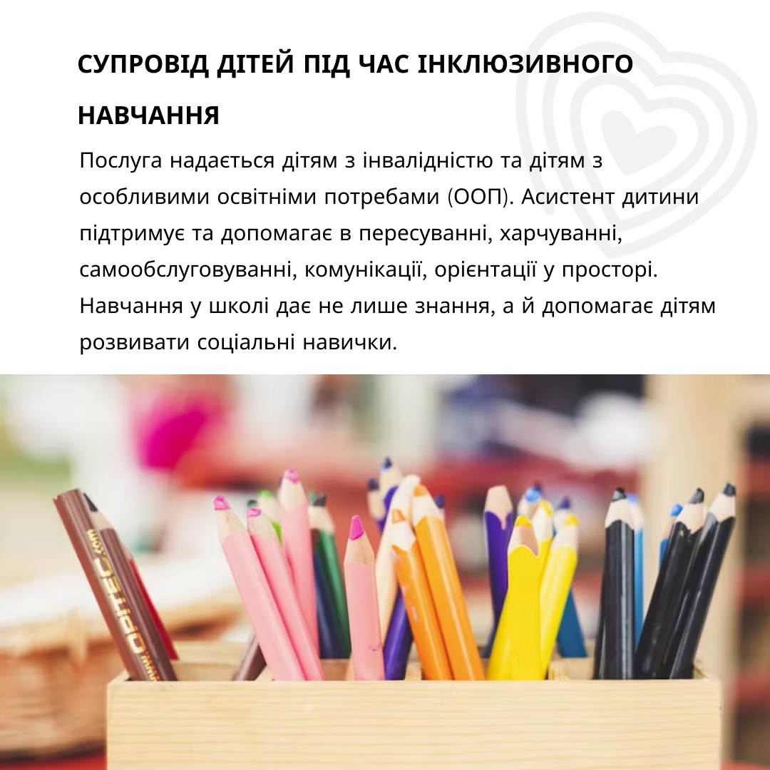 🟦 Супровід дітей під час інклюзивного навчання – забезпечить дітям з особливими освітніми потребами необхідну підтримку та допомогу в навчанні.