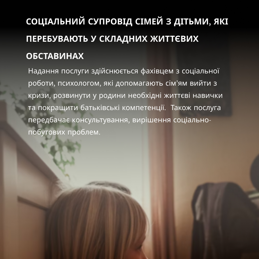 🟩 Соціальний супровід сімей з дітьми, які перебувають у складних життєвих обставинах – надасть сім’ям необхідну підтримку для подолання кризових ситуацій та покращення умов життя.