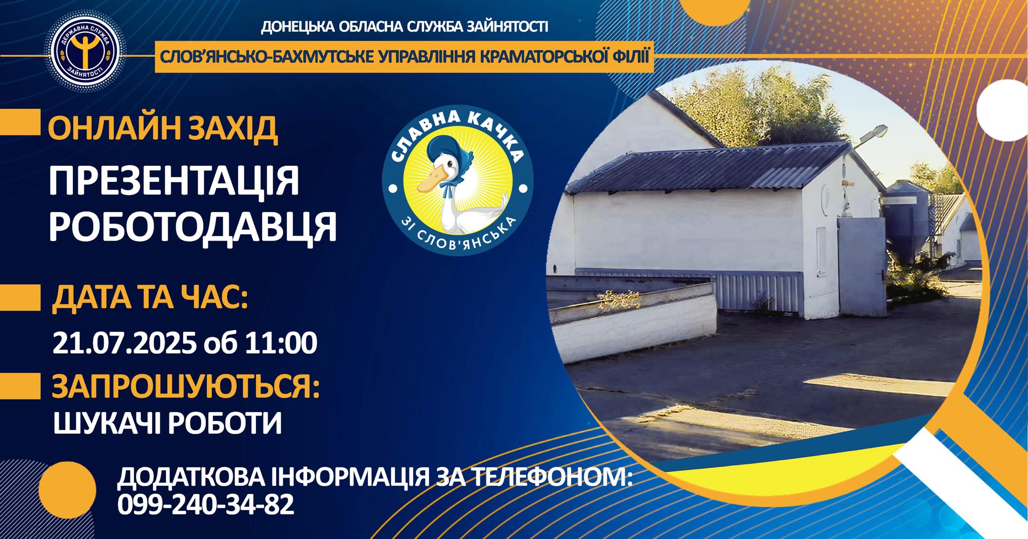 Слов’янсько-Бахмутське управління Краматорської філії Донецького обласного центру зайнятості радо запрошує всіх, хто шукає роботу, долучитися до цікавої онлайн-презентації від провідного підприємства регіону. Захід відбудеться 21 липня 2025 року, початок о 11:00. Це чудова нагода дізнатися про актуальні вакансії та можливості кар’єрного зростання.