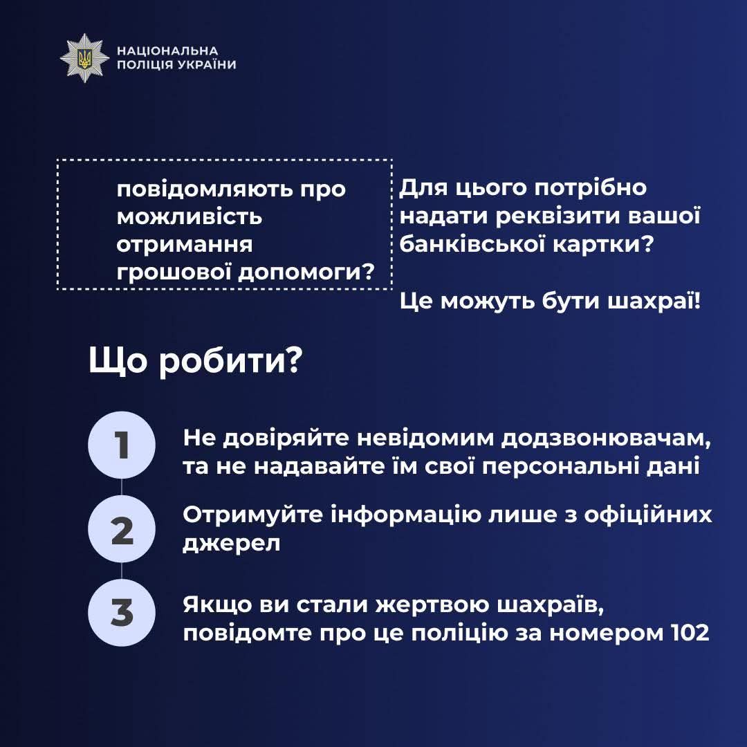 ⚠️ Поліція наполегливо рекомендує громадянам: якщо ви отримуєте повідомлення або бачите інформацію про грошові виплати від будь-яких установ, завжди перевіряйте її достовірність через офіційні джерела. Не довіряйте сумнівним оголошенням та збережіть свої заощадження.