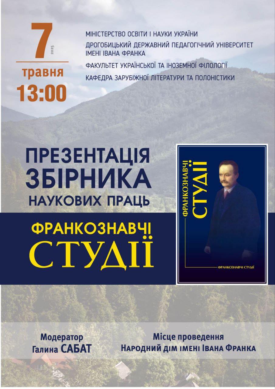 Відкрийте для себе глибини франкознавства у Дрогобичі! 7 травня о 13:00 годині в Народному домі імені Івана Франка відбудеться презентація нового збірника наукових праць під назвою «Франкознавчі студії». Це унікальна можливість долучитися до обговорення та ознайомлення з актуальними дослідженнями, присвяченими життю та творчості видатного українського письменника, поета, мислителя та громадського діяча Івана Франка.