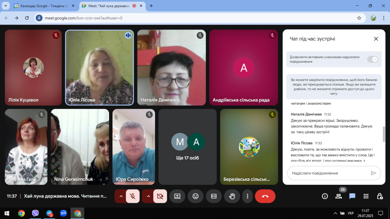 Під час онлайн-діалогу учасники обговорювали надзвичайну важливість державної мови як символу національної єдності та духовного коду нації 💬. Наголошувалося на цілющій силі слова, адже саме поезія допомагає загоювати душевні рани, підтримувати дух, надихати та говорити про найскладніші речі. У ці важкі часи вірш стає надійним зв’язком із собою, близькими та рідною землею 🌍.